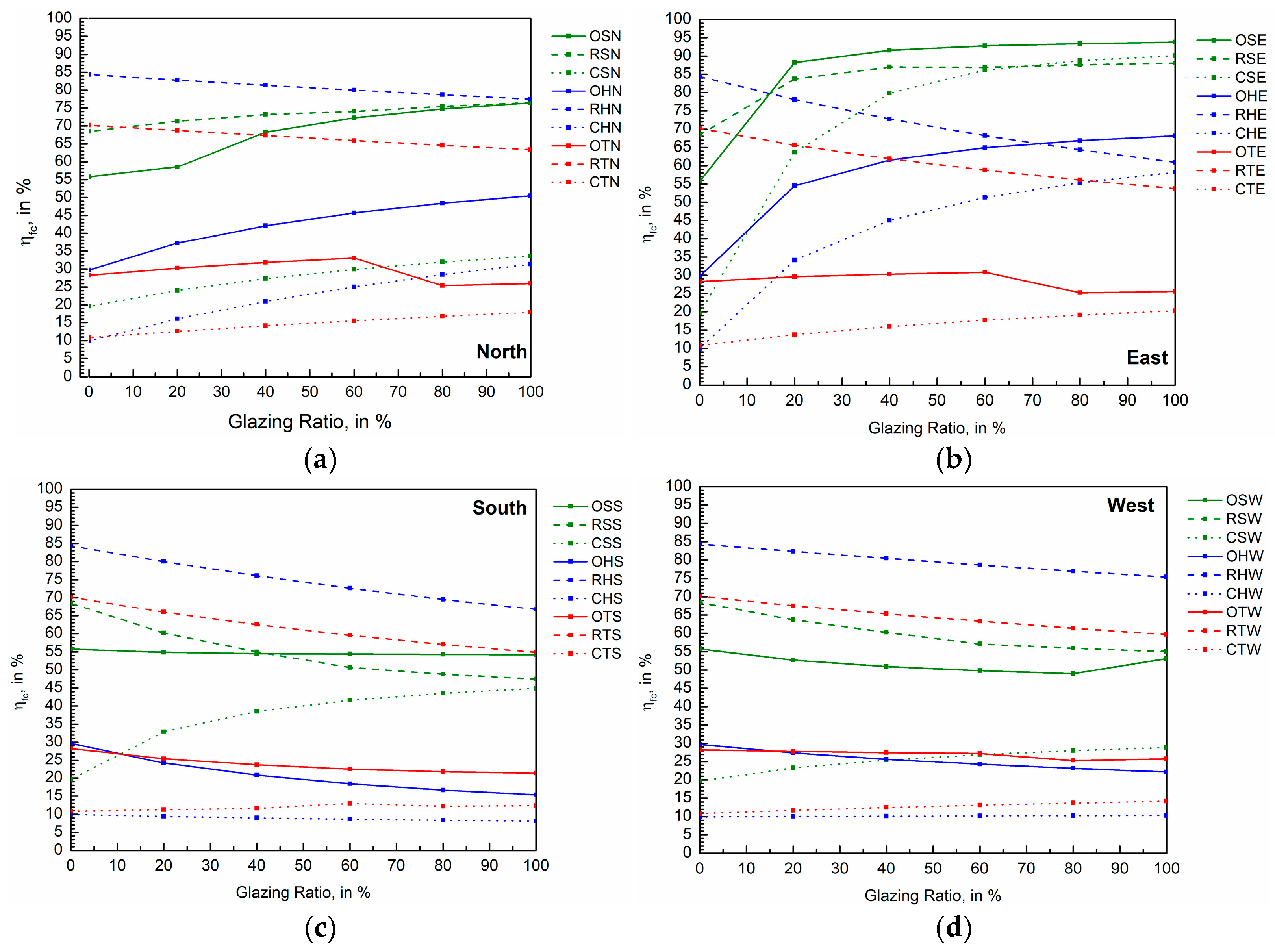 Based on Figure 8, the ηfc values indicate significant variability. This variability warrants a detailed examination of ηfc by orientation, target day, and building type, evaluated as a function of glazing ratio. Generally, higher glazing ratios reduce ηfc variability, regardless of building function. The residential building exhibits the highest fluctuation (74.11%), independent of each orientation. By contrast, the office building exhibits the lowest fluctuation, with values depending on orientation (north: 42.87% in Figure 8a; east: 5.72% in Figure 8b; south: 9.27% in Figure 8c; and west: 26.14% in Figure 8d).