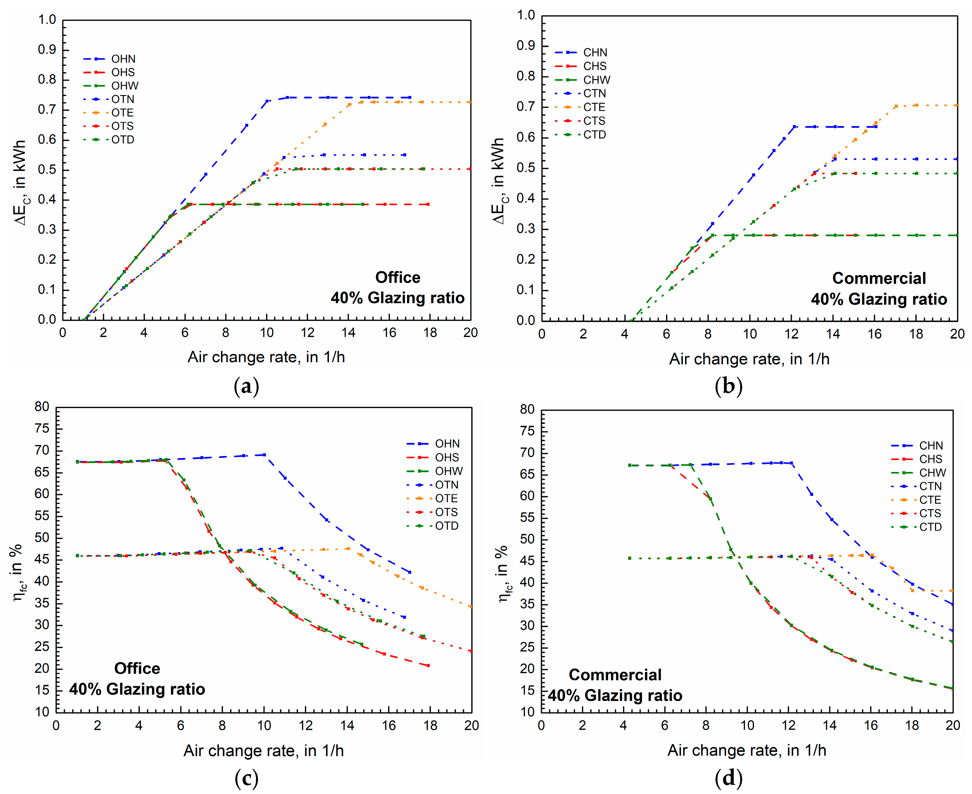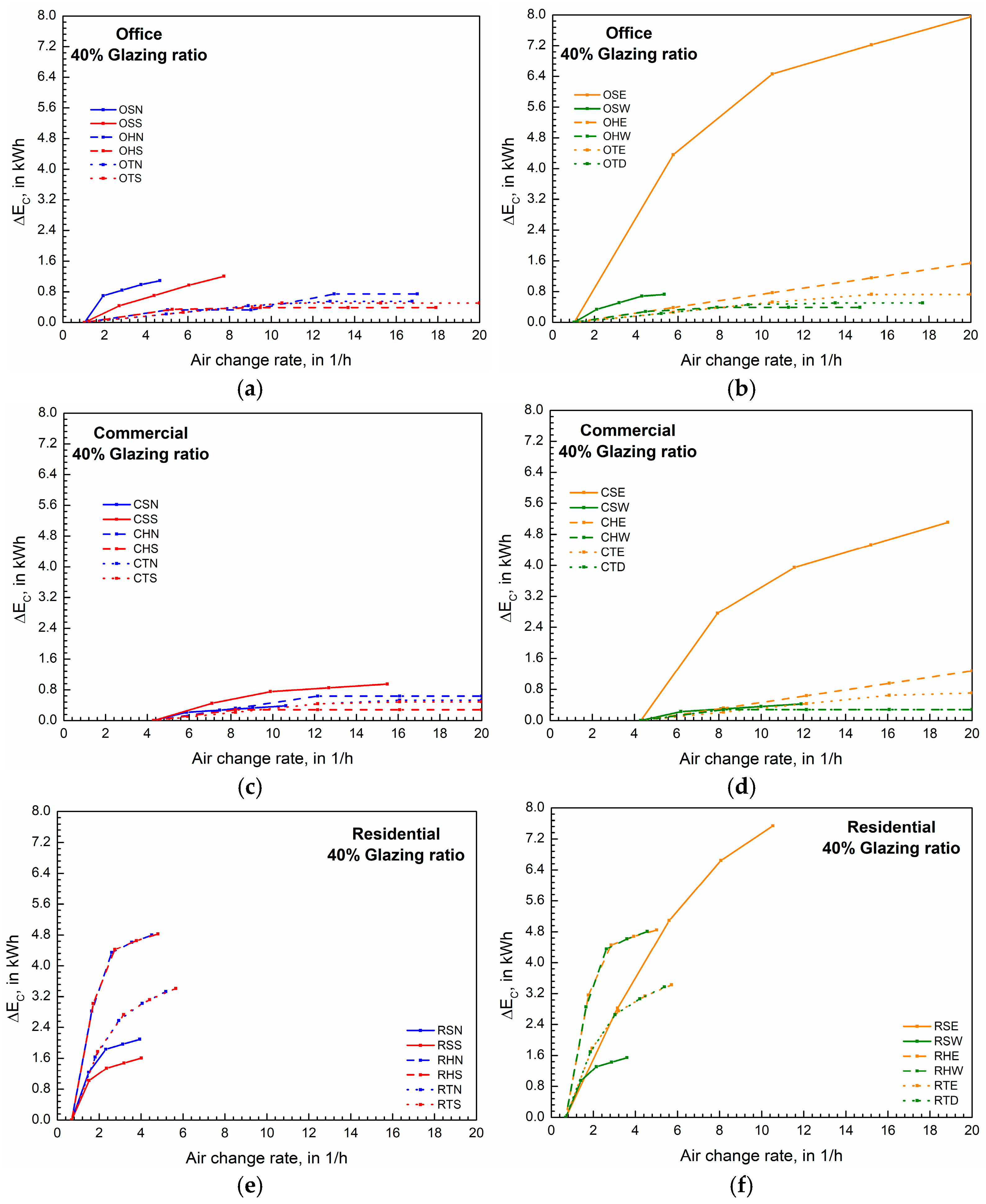 The following analysis examines the impact of increasing the minimum air change rate (nmin) by ∆n on the avoided mechanical cooling energy (∆EC). In other words, the fresh air requirement defined by the building function is satisfied (nmin), and enhanced free cooling (EFC) operates beyond this minimum (nmin + ∆n).