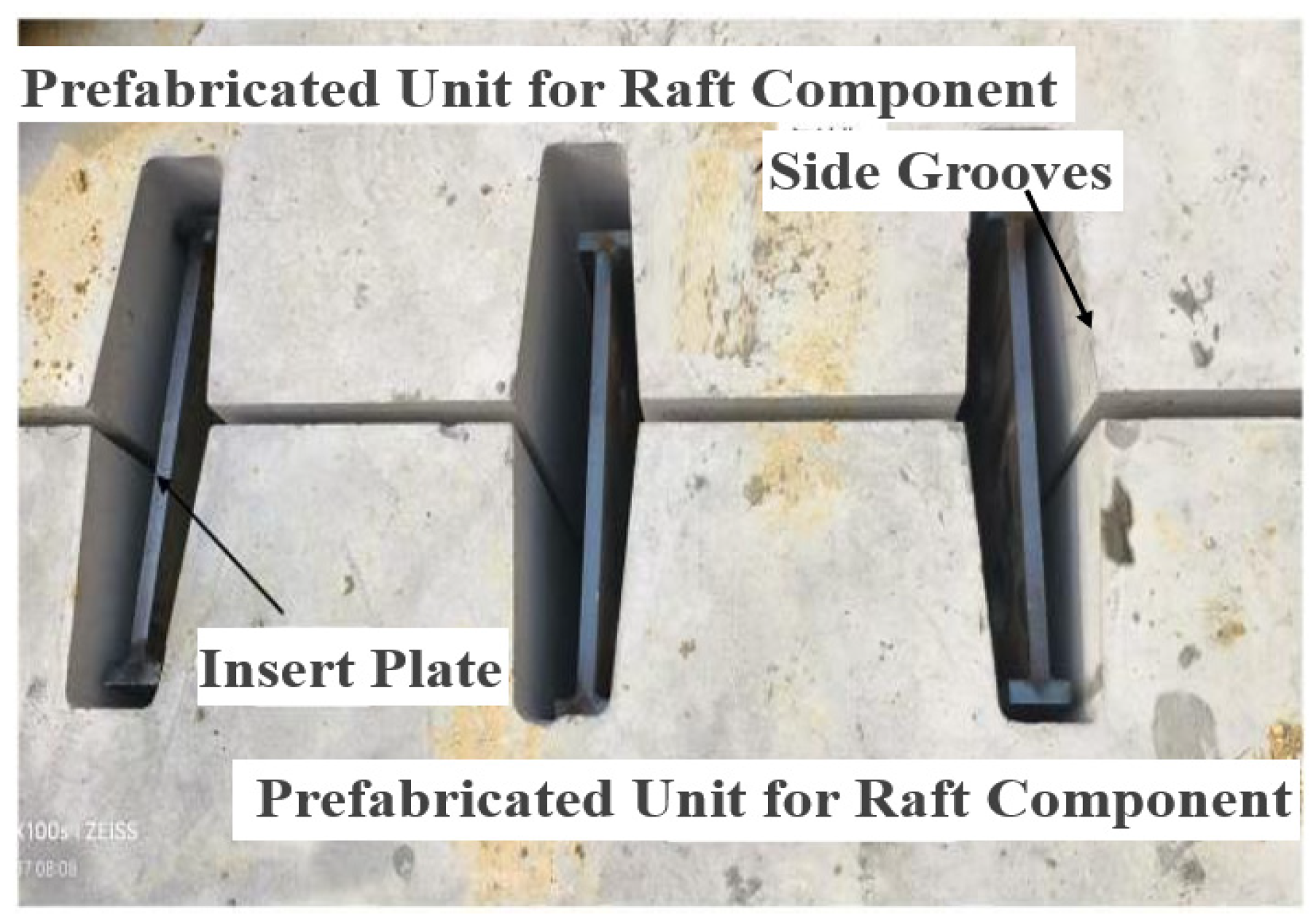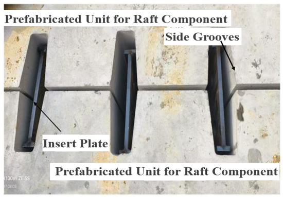 Ju, H.; Zhang, K.; Wang, X.; Tang, Y.; Huo, X.; Jiang, W.; He, S.; Li, T.; Tong, X. Bending Test and FE Analysis of Novel Grouted Plug-in Connection for Prefabricated Assembled Raft Foundation. Buildings 2025, 15, 3931. https://doi.org/10.3390/buildings15213931