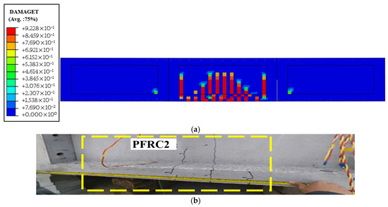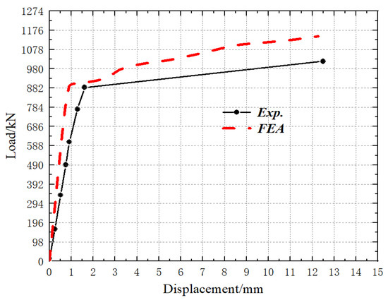 - In the elastic phase, the slopes of the experimental and numerical load–displacement curves are 549.8 kN/mm and 945.7 kN/mm, respectively, indicating that the numerical model has greater bending stiffness. Material parameters or contact settings in the finite element modeling have increased the model stiffness to a certain extent, thereby enhancing its bending stiffness. The ultimate bending moments obtained from the test and simulation are 736.5 kN·m and 859.5 kN·m (ratio: 0.86, discrepancy: 14%), respectively, reflecting the difference between the two. All data demonstrate that the prefabricated raft foundation specimens possess qualified bending stiffness and exhibit good load-bearing capacity.