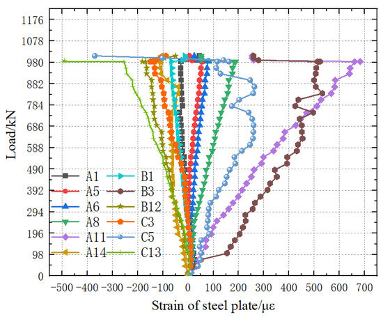 - Upon reaching the ultimate load, there was no obvious damage at the inserted plate joints, while pronounced flexural failure occurred near the inserted plate joints of the specimen. Therefore, the connection joints possess sufficient strength, and the configuration of the steel reinforcement cages in the prefabricated units needs to be optimized to improve their flexural resistance.