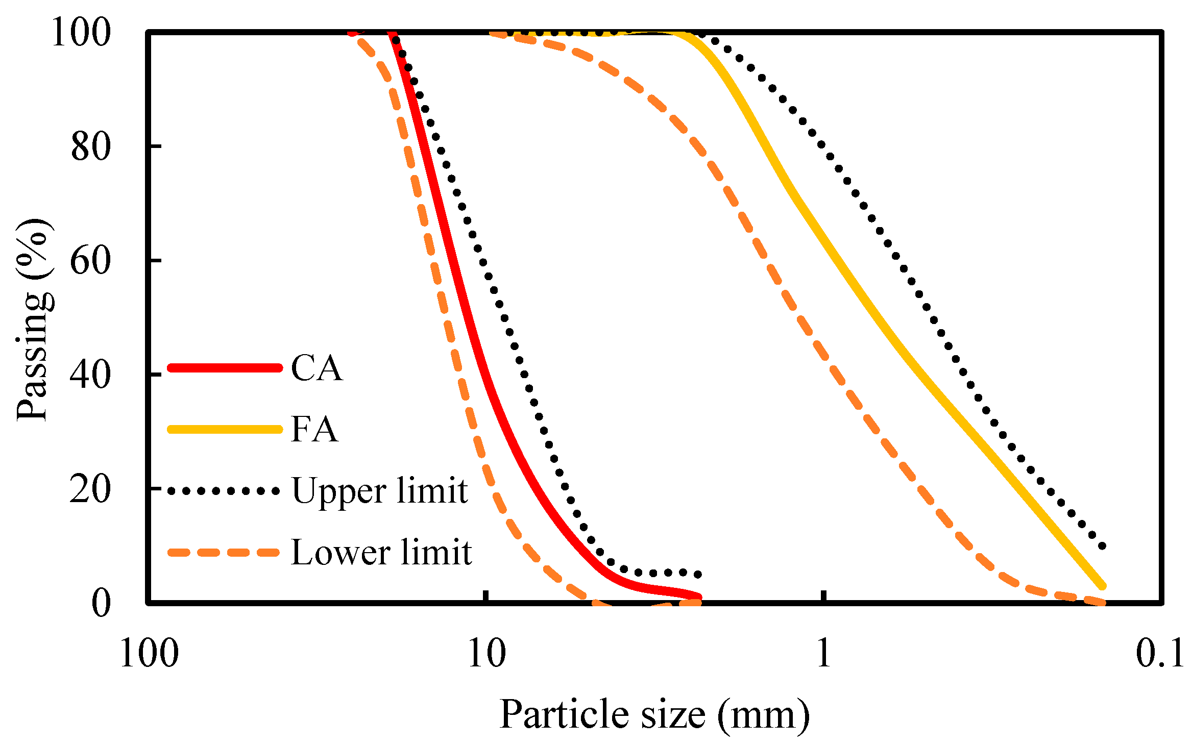 Figure 4 shows the particle size distributions for coarse aggregate (CA) and fine aggregate (FA).