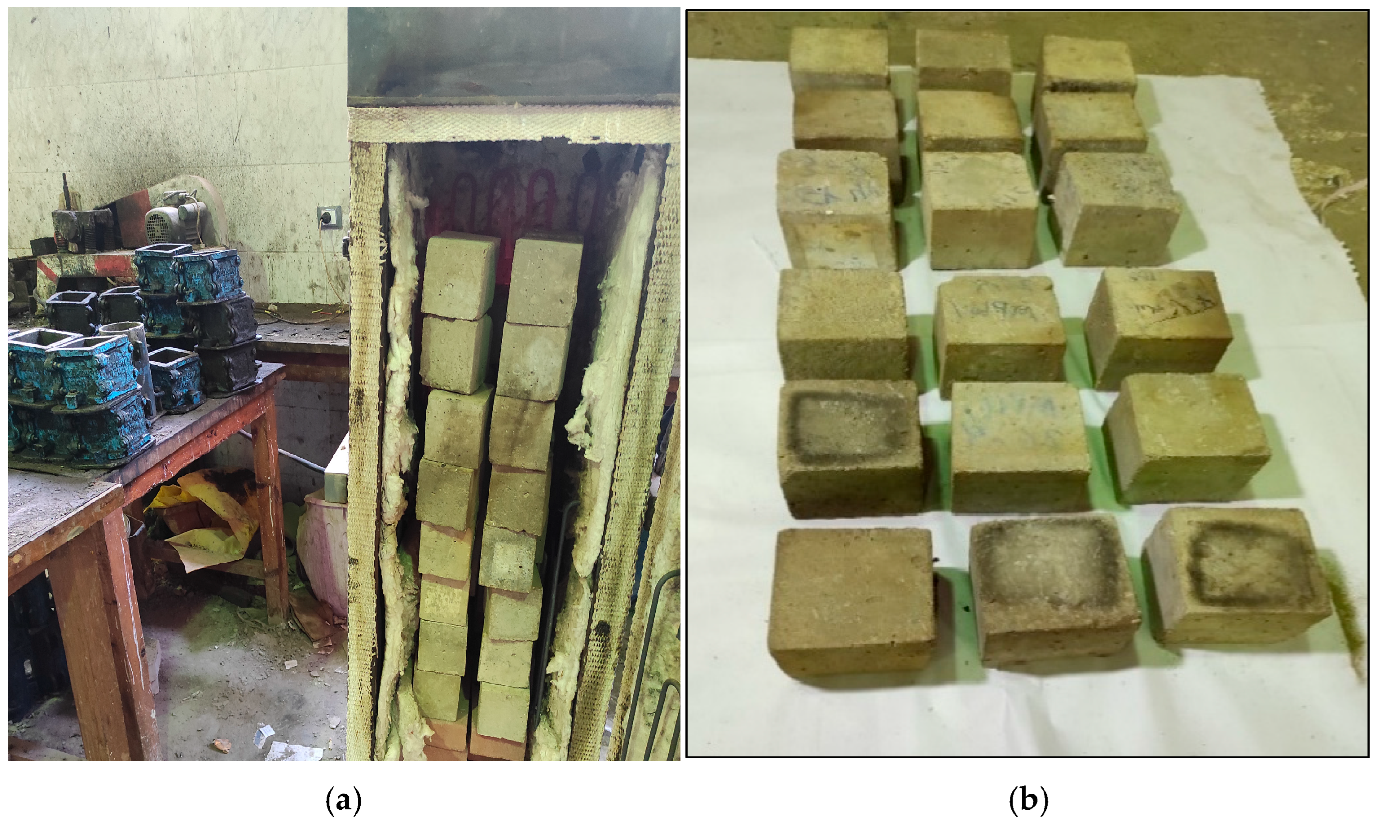 Figure 6b shows the concrete specimens after temperature exposure in an electrical furnace. The temperature regimes followed the ISO 834 fire resistance curve. Specimens were exposed to temperatures of 200, 400, 600, and 800 °C for durations of one and two hours. Air cooling was applied to the specimens before conducting the compressive strength test to determine the residual strength after exposure to elevated temperatures.