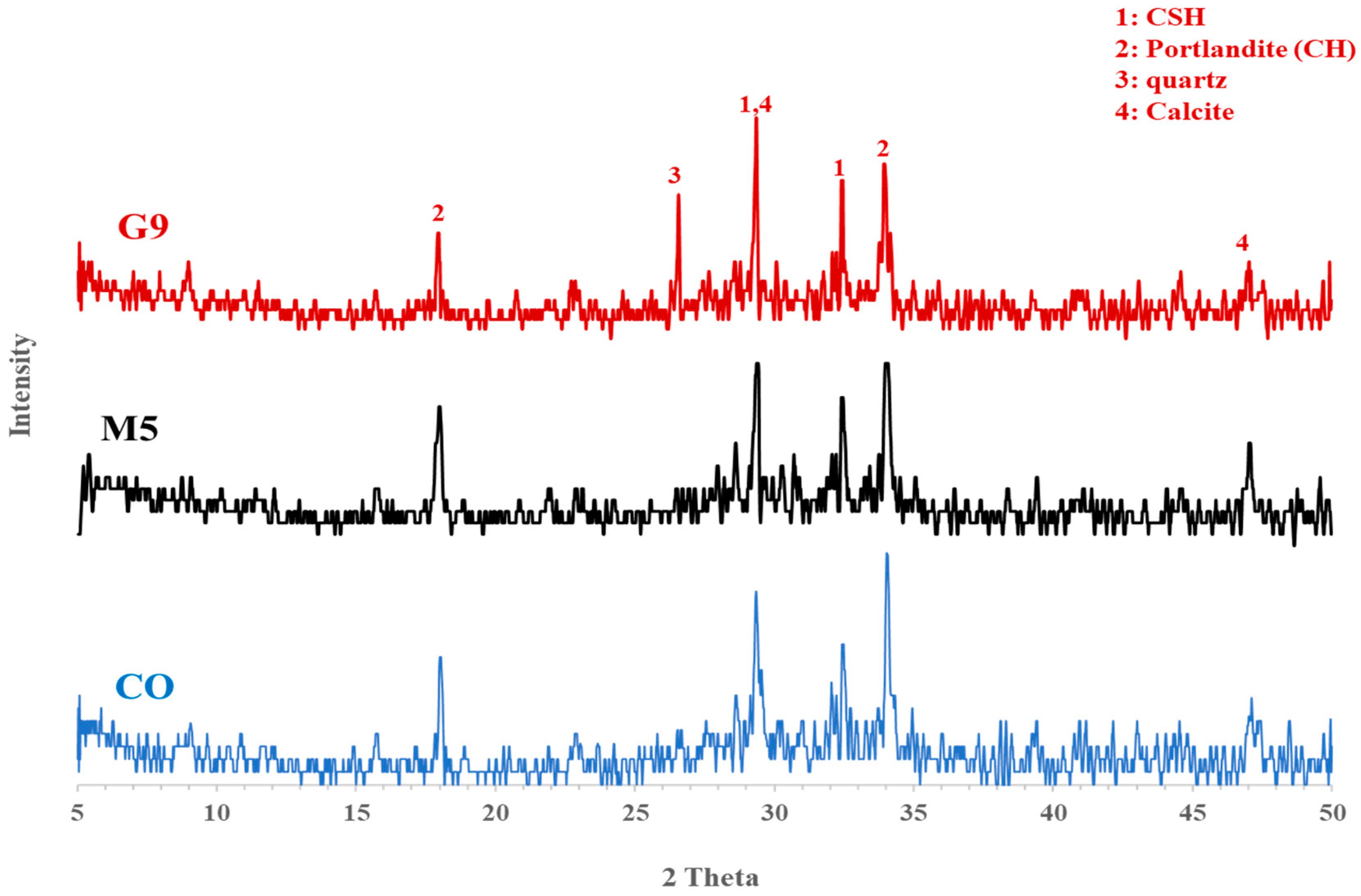Figure 7, illustrate the distinct mineralogical phases of the control and optimized mixes. Results showed that the G9 paste exhibited a notable increase in CSH peak intensity compared to CO, indicating enhanced CSH formation, which contributes to increased mechanical strength. Concurrently, a reduction in portlandite peak intensity suggests its consumption through pozzolanic reactions with the high-silica content of G9, consistent with findings by Abouelnour (2024) [