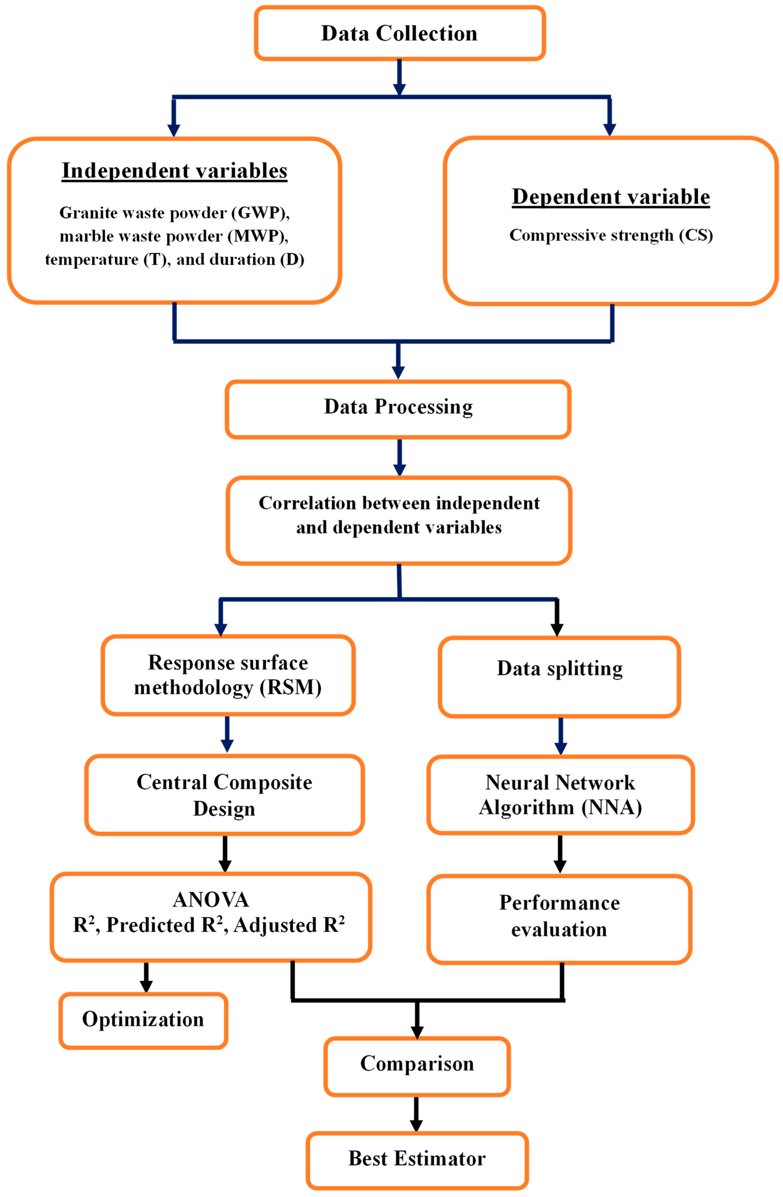 Figure 8 shows the methodology used in this study. The adopted research methodology integrates both experimental data analysis and advanced computational modeling approaches, combining Response Surface Methodology (RSM) and Neural Network Algorithm (NNA) to predict the compressive strength of concrete incorporating granite and marble waste powders under elevated temperatures. The investigation begins with a systematic Data Collection phase, where the independent variables—namely Granite Waste Powder (GWP), Marble Waste Powder (MWP), Temperature (T), and Duration (D)—are identified and varied to observe their effect on the dependent variable, Compressive Strength (CS). Following data acquisition, the Data Processing stage involves an initial analysis to determine the Correlation between these independent factors and the compressive strength, providing preliminary insights into their relationships. The core of the experimental design is structured around the Response Surface Methodology (RSM), specifically utilizing a Central Composite Design (CCD), to efficiently explore the variable space and model the response surface with a polynomial equation. This model is rigorously validated using ANOVA to assess statistical metrics such as R