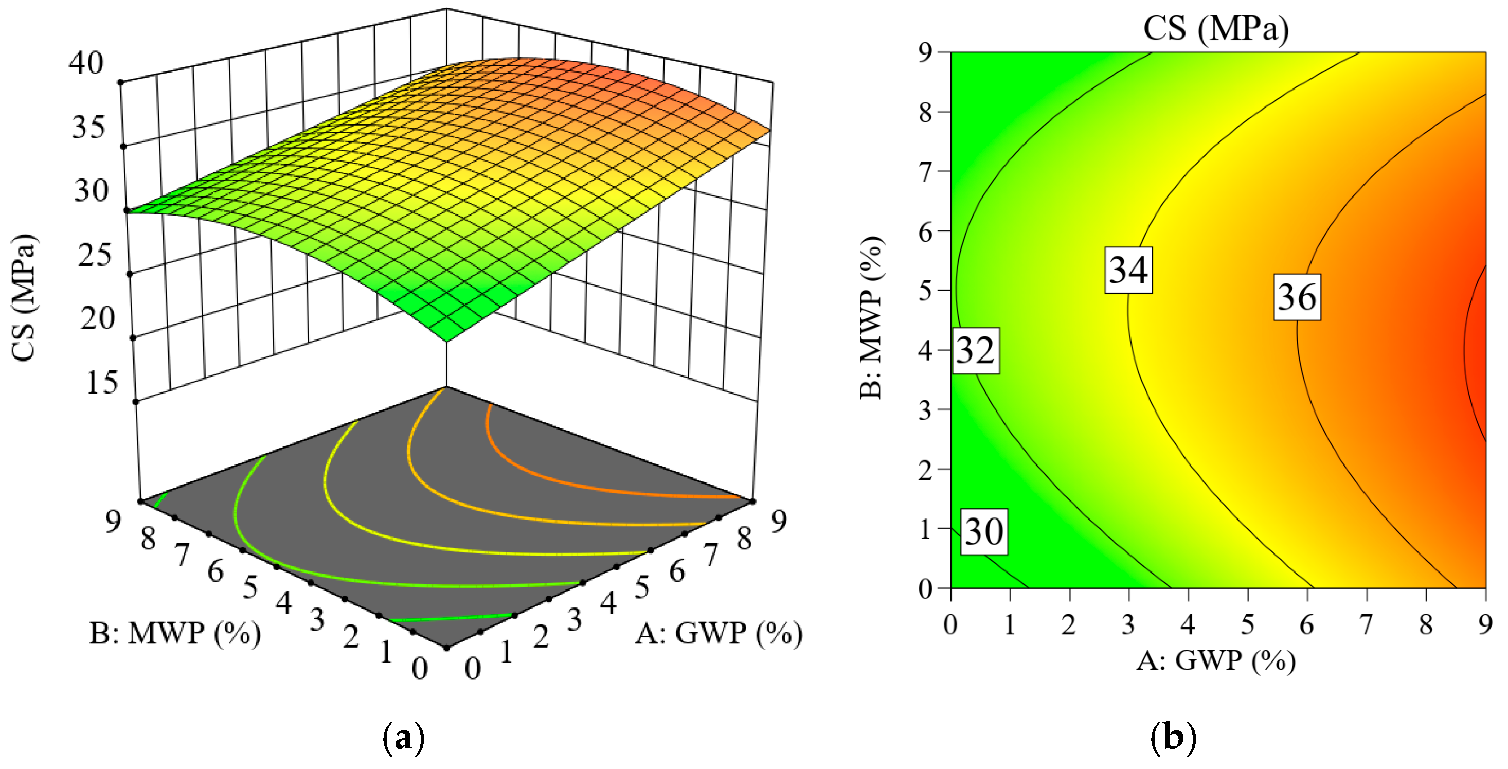 RSM, specifically using a central composite design (CCD), was utilized to develop models for predicting the compressive strength of concrete samples incorporating MWP and/or GWP. RSM was employed to investigate the impacts of inclusion of these wastes in concrete on its strength when exposed to high temperatures utilizing Design-Expert software (Version 13). The used models were linear when the curvature did not exist or polynomials of higher degree when curvature was present. The general formulas for linear and quadratic models are presented in Equations (1) and (2). The optimization in RSM was employed by maximizing the response and using the values in ranges for all independent parameters.