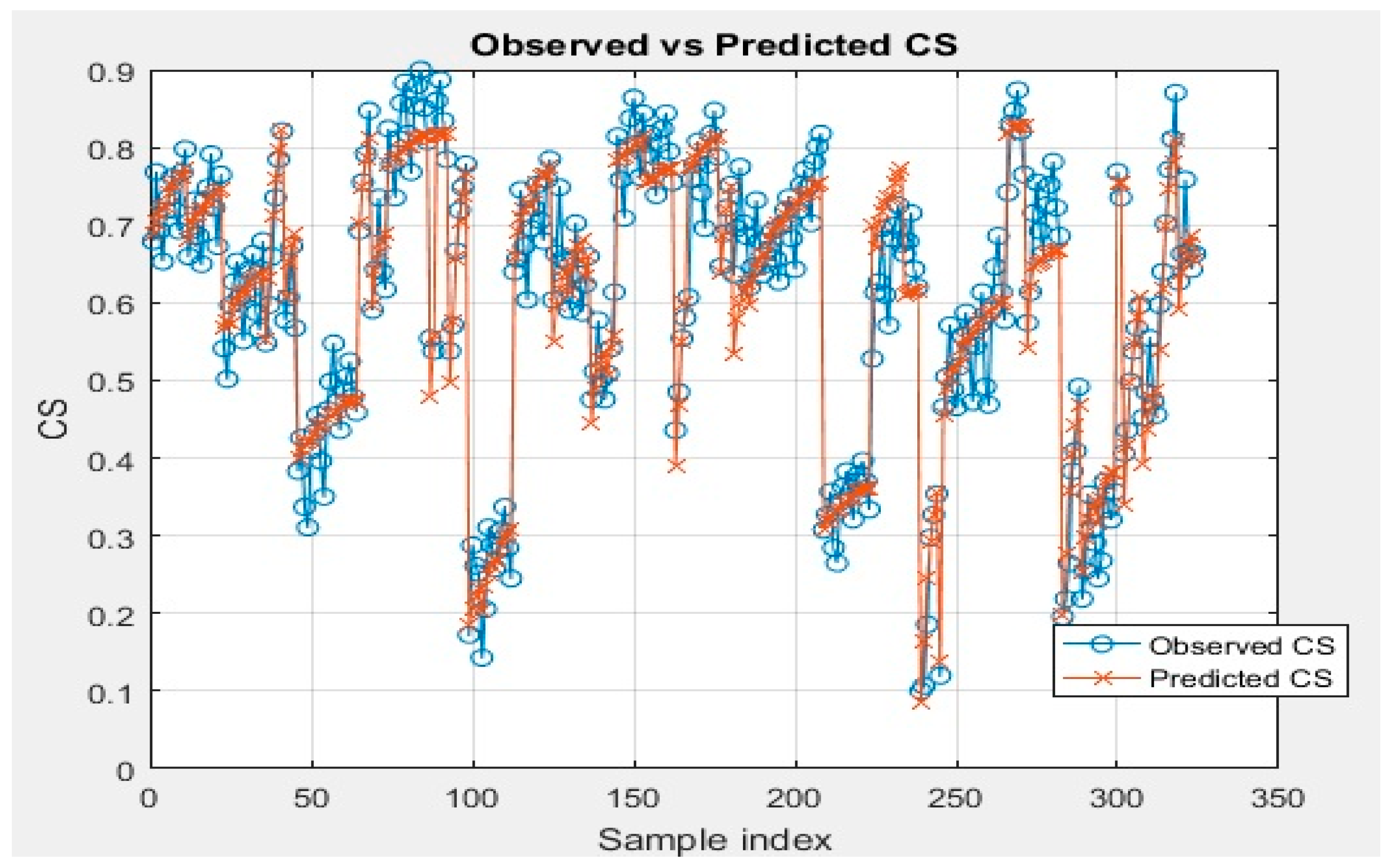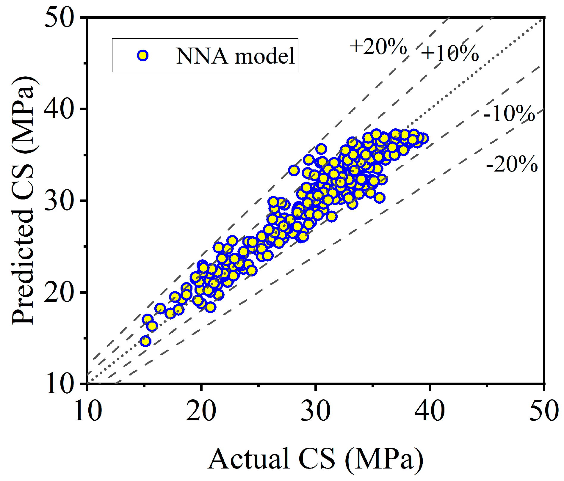 2 of 0.9494, which confirms its strong capability to model the complex, nonlinear interactions within the data. However, with an MAE of 1.1590 MPa, an RMSE of 1.5297 MPa, and a MAPE of 3.97%, its predictive accuracy and precision are demonstrably lower than those of the Quadratic model, though still vastly superior to the Linear model. The RMSE, which penalizes larger errors more heavily, is notably higher for the NNA, implying it produced more significant outliers in its predictions compared to the Quadratic model. In conclusion, while the NNA proves to be a powerful tool, the Quadratic model derived from Response Surface Methodology stands out as the most robust and accurate predictor for CS of concrete.