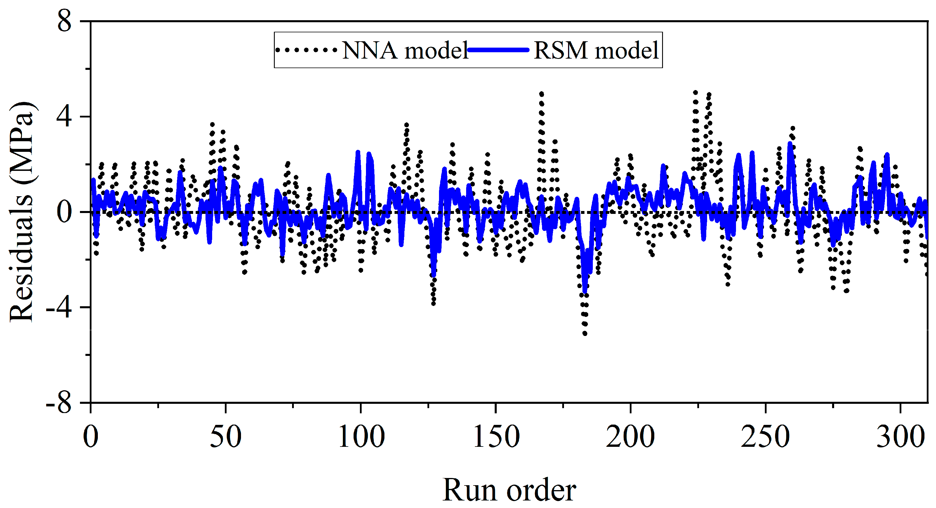 Figure 16 for CS, the predictive performance and error patterns of the NNA and RSM models can be comprehensively evaluated. The plot illustrates the distribution of residuals—the differences between the actual measured compressive strength values and the model-predicted values—across the experimental run sequence. Both models maintain residuals within a relatively tight band around zero, indicating consistent over-prediction/under-prediction across the entire dataset. However, closer inspection reveals distinct patterns in their error behavior. The RSM model demonstrates a more consistent and stable residual distribution, with its errors clustered more tightly and showing less scatter, which aligns with its previously reported superior statistical metrics like a lower RMSE. In contrast, the NNA model, while also generally accurate, appears to display slightly greater variability in its residuals. This suggests that the NNA, despite its capacity for capturing complex nonlinearities, might be slightly less precise than the RSM model for certain experimental conditions in the run order. Overall, the residual analysis confirms that the RSM model provides a more robust and reliable prediction with less volatility in its errors, while the NNA model remains a strong but slightly less consistent performer.