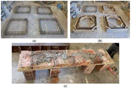 The concrete used for the frames had a design strength of C25/30 (fck = 30 MPa), while B500C steel was used for reinforcement as per BS 4449 and EN 1992-1-1 [22,23]. RC frames were built in the laboratory. The concrete was poured into the formwork after the steel reinforcement was assembled. The curing process lasted 28 days before testing began (Figure 3). To ensure consistency, all frames were poured from the same batch of concrete. Compressive strength tests were performed on three cubic specimens (150 mm × 150 mm × 150 mm) in accordance with EN 206-1 [24].