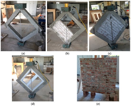 In this experimental campaign, five wall panels with different infill configurations were prepared and tested under diagonal compression, with one full-scale specimen per configuration due to the size and complexity of the setup. The mechanical properties of the constituent materials were determined from three replicate laboratory tests for each material type to ensure data reliability. Four were RC frames: one without infills (bare frame), one with 50% masonry infill, one with full (100%) masonry infill, and one with an aluminum window frame. In addition, a load-bearing masonry wall specimen (1200 × 1200 × 250 mm) was tested as a control, to compare the strength of the masonry alone with the structural behavior of the mixed RC–masonry panels. The infill was created by laying recycled clay solid bricks in a stretcher bond connected by a 15 mm thick mortar layer 14 days after the RC bare frame was cast. The frames were allowed to cure for an additional 28 days to ensure the mortar reached full strength. Once the concrete was cured, the specimens were tested in the test setup mentioned above by an incremental loading scheme until a failure mode was observed.