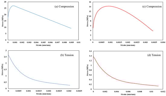 Stress–strain input parameters used in modeling: (a,b): concrete; (c,d): masonry.