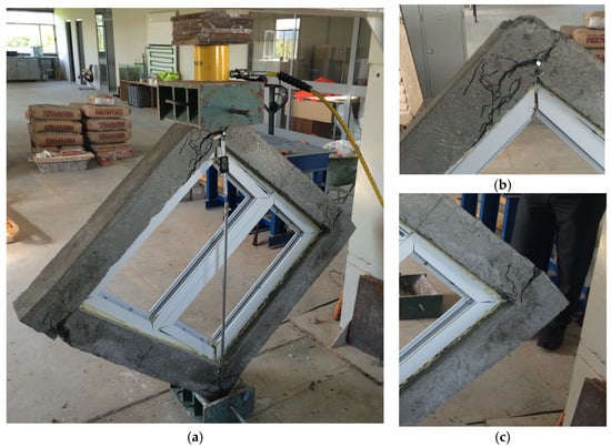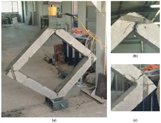 (a) Failure mode of the bare frame (0% infills); (b,c) Tension failure of concrete at the corners of the frame.