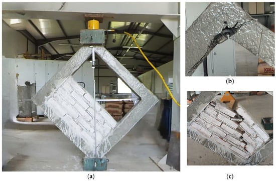 The main mechanical properties of the construction materials were assessed individually prior to the diagonal compressive testing (Figure 4). The bricks used in the study were common solid clay bricks of 245 × 120 × 70 mm, retrieved from a demolished masonry structure. Bricks were subjected to flexural and compressive testing to assess their mechanical properties as per EN 771-1 [25]. The mortar used in this study for both load-bearing and infill walls was a traditional cement-lime mortar with a mix ratio of 1:1.5:6 (lime, cement, sand by volume). Mortar samples were cast in prismatic molds (40 × 40 × 160 mm) and cured for 28 days, after which flexural and compressive tests were conducted following EN 196-1 [26]. The average compressive strength of the mortar was recorded at 4.3 MPa, consistent with typical values used for masonry construction with a bed joint thickness of 15–20 mm [5]. The mechanical properties are listed in Table 1.