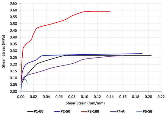 Experimental shear stress–strain diagram for all the tested specimens.