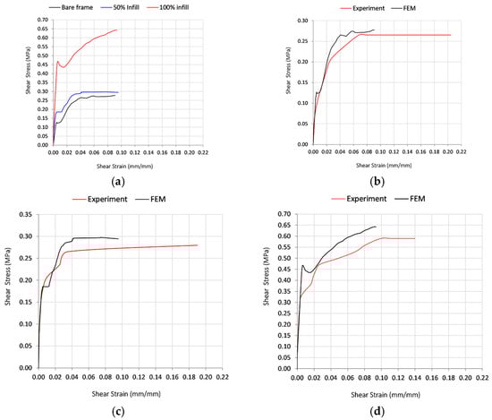 In addition to strength improvements, the infill also influences the ductility and post-peak behavior of the frame. The bare frame reaches its plateau in strain earlier and maintains a lower overall strain, indicating a ductile behavior but limited load-bearing capability. The 50% infill frame similarly reaches its strain plateau but shows slightly more resistance to deformation than the bare frame. On the other hand, the 100% infill frame experiences a sharper initial increase in shear strain with increasing stress but plateaus at a lower strain level compared to the other frames, reflecting a stiffer response. This behavior suggests that the fully infilled frame deforms less and maintains structural integrity under higher stresses, which implies enhanced rigidity and reduced susceptibility to large deformations under load.