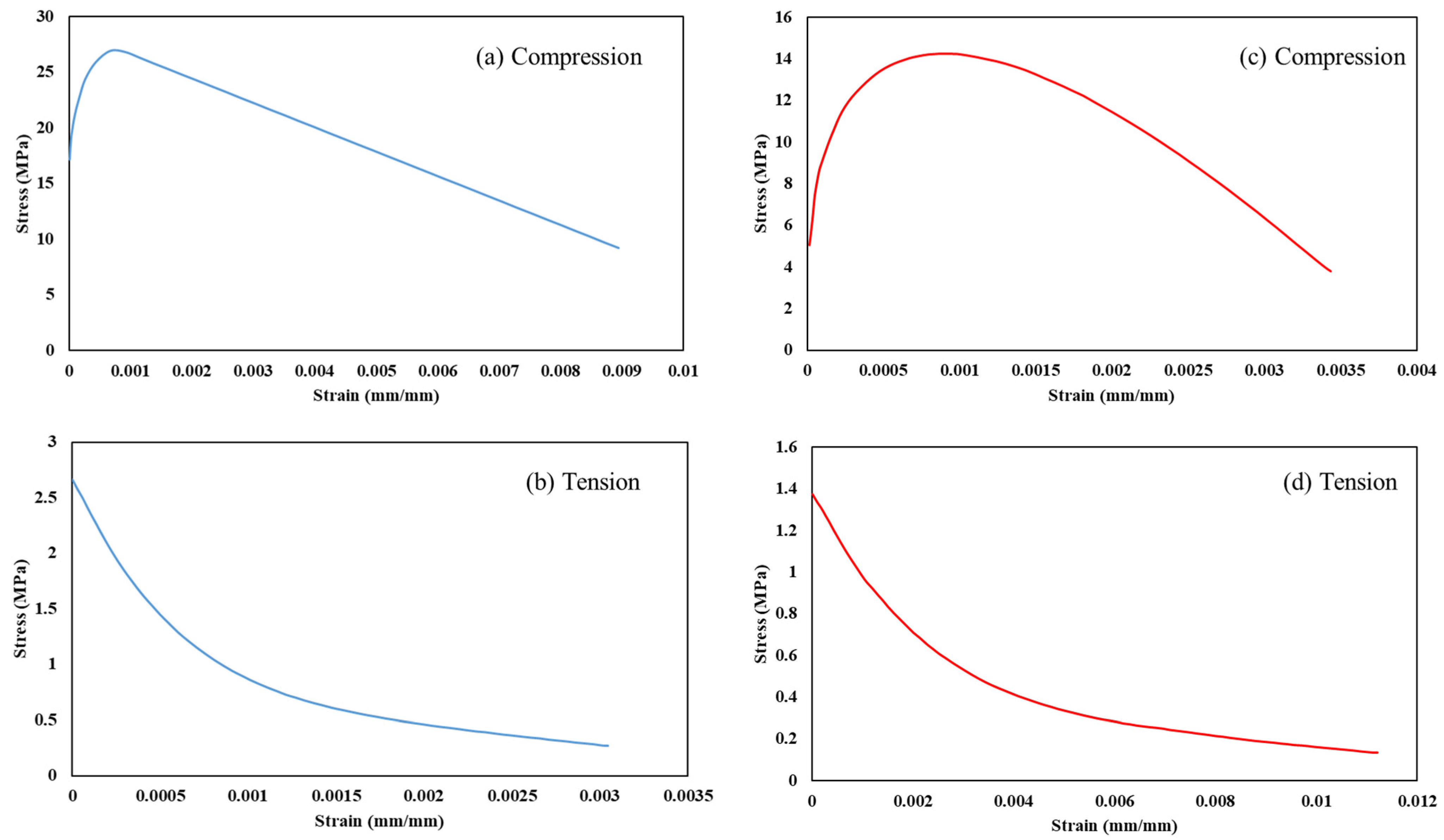 The Concrete Damaged Plasticity (CDP) model [29] was employed to model nonlinearity in concrete and masonry. The dilation angle (φ), equibiaxial-to-uniaxial strength ratio (fb′/fc′), yield surface shape factor (Kc), eccentricity (ε), and viscosity (μ) are key parameters needed for simulation. The dilation angle was set to 7°, whereas default values 1.16, 0.667, and 0.1 were used for fb′/fc′, Kc, and ε, respectively. The viscosity parameter was taken to be 0.005 for both concrete and brick. The input stress–strain values used in the model, which were generated using software developed by Elkady [30], are shown in Figure 6. The average compressive strengths of the concrete and masonry units (brick and mortar), obtained experimentally, were 34.01 MPa and 14.01 MPa, respectively. The equivalent cylinder strength for the concrete material was taken as 80% of the cube strength, which is 27.21 MPa.