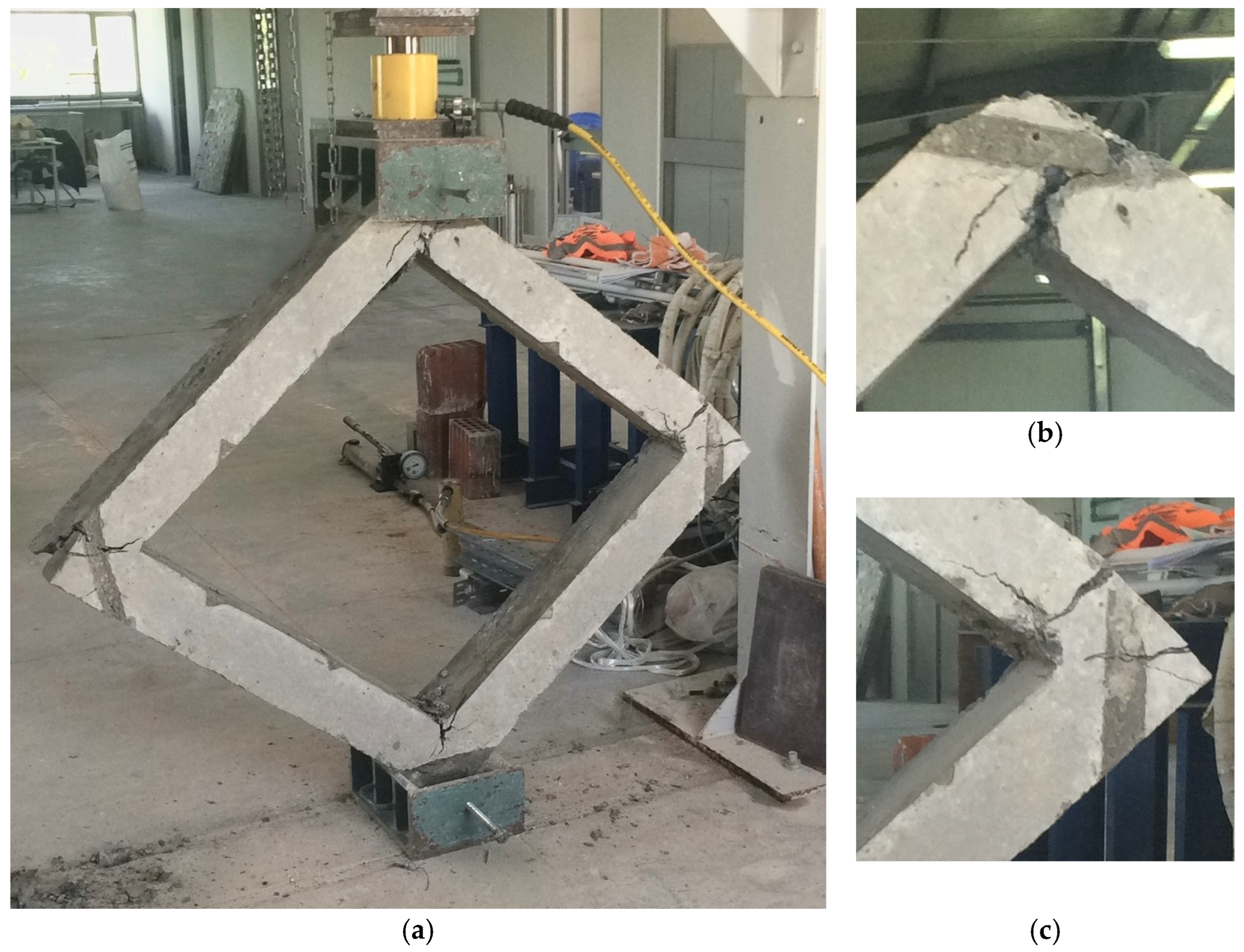 Figure 10. (a) Aluminum frame infill frame, (b,c) tension failure of concrete at the corners of the frame.