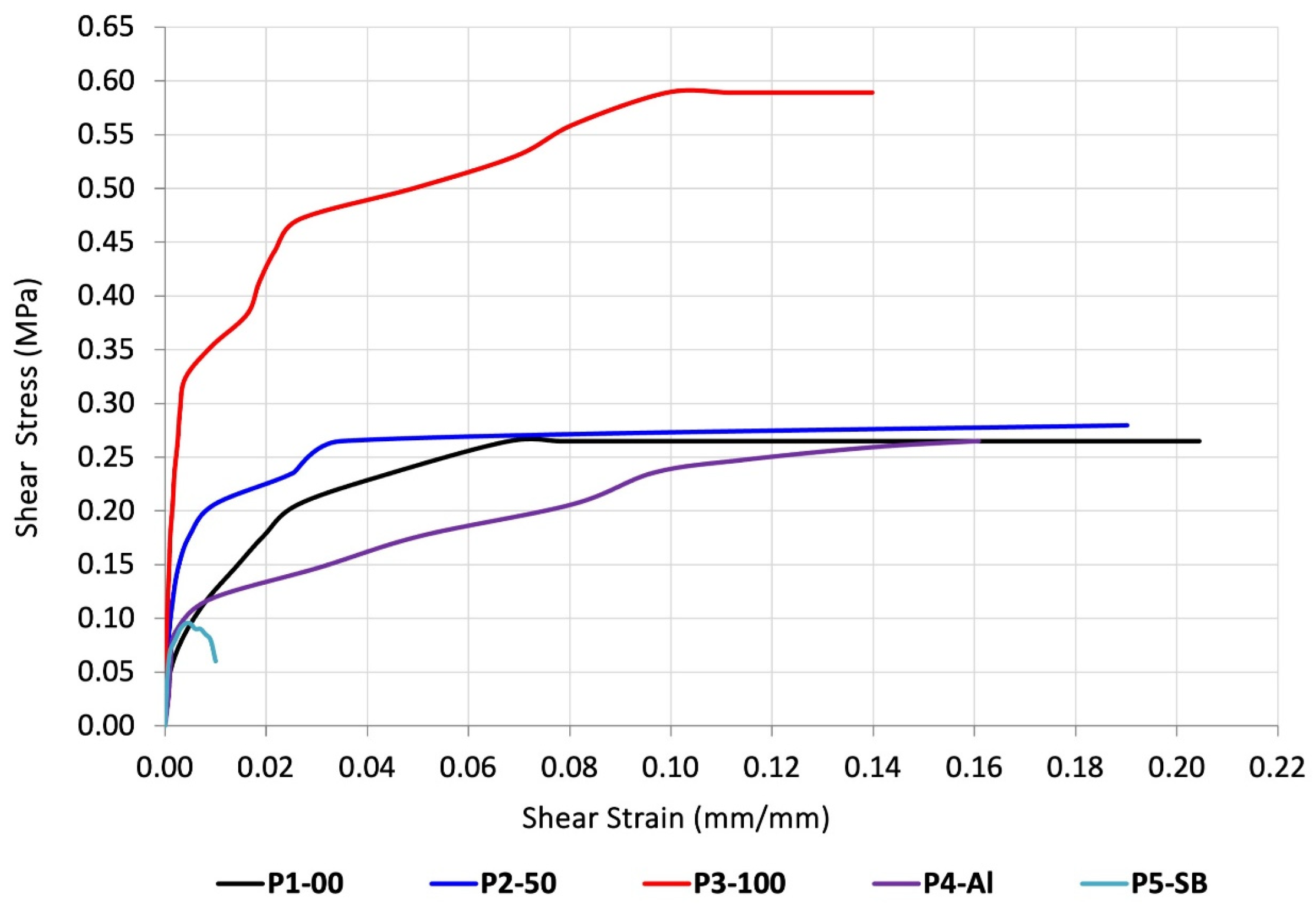Another parameter to assess the structural behavior of the frames was the shear stress–strain curve presented in Figure 12. As expected, P1-00 exhibited the lowest shear strength, reaching a peak shear stress of 0.265 MPa. This is due to the absence of infill, which results in a lower lateral stiffness and capacity to resist applied shear forces. The inclusion of infill enhances the frame’s shear strength, with the 50% infill case reaching a peak of 0.280 MPa and the 100% infill case peaking at around 0.590 MPa. This trend indicates that increasing the infill percentage leads to higher shear capacity, likely due to the enhanced load transfer and lateral stiffness that the infill provides. However, as previously reported, partial infill brick applications do not cause significant shear load capacity increments.