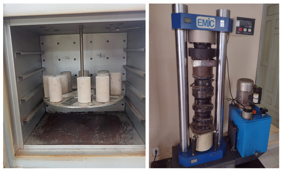 The SPs were molded in cylindrical molds 50 mm × 100 mm, previously greased with vegetable oil. The mortar was allocated in four dense layers with approximately 30 strokes in each, using a manual socket. The SPs remained in the mold for the initial 24 h, and after demolding, they were taken to the tank and immersed.