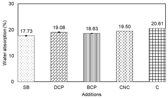 Figure 4 shows the water absorption index for each addition analyzed. The control sample (C), without additions, is the highest absolute index. The intermediate values are found in the DCP, BCP, and CNC additions, with a range of variation between 18.63 and 19.50%. The lowest absolute value is shown by SB.