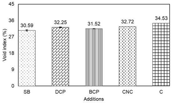 Figure 5 shows the void rates calculated throughout the treatments. The highest index was found in addition C. The intermediate values of the DCP, BCP, and CNC additions vary in the range between 31.52 and 32.72%. The lowest absolute value is from the SB addition.