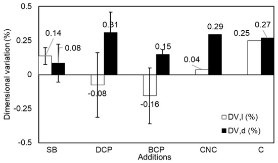 Figure 7 shows the relation obtained, after statistical analysis, of the dimensional variation calculated between the additions, considering the dimensions of length and diameter. The additions of DCP and BCP indicated a retraction in the variation in the length of the observed SPs. The highest index of DV,l was presented by addition C. In relation to DV,d, there were no cases of retraction, and additions such as DCP and CNC were, in absolute number, higher, while the CNC addition showed the lowest index found.