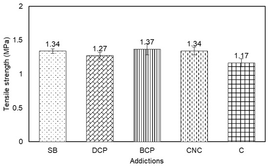 Figure 8 shows the relations found for the mean values of tensile strength in each addition. In the range of highest tensile strength, in absolute value, are the BCP and CNC additions. On the other hand, the lowest performance in tensile strength is presented by addition C. The SB and DCP treatments show intermediate values. Despite the result found in the SB treatment, as it is an in natura addition and the research looks for additions whose treatments extend their useful lives in buildings, its validity for the objectives of the study is discarded.