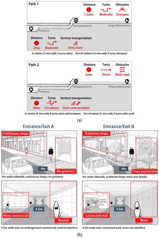 To avoid the cognitive burden of presenting all 12 selected attributes simultaneously within a single choice task [51], and more importantly, to ensure that the experimental design aligns with passengers’ perceptual structure of the travel environment, the attributes were reorganized under a dual-logic framework. At the theoretical level, drawing on the classical distinction between accessibility and attraction in travel behavior research [52], the 12 attributes were reorganized into two complementary dimensions: path accessibility and environmental quality. The former emphasizes walking efficiency and continuity, reflecting the ease with which passengers travel from the platform or from urban origins or destinations to a specific metro entrance/exit. The latter focuses on spatial attractiveness and walking comfort, reflecting passengers’ willingness to use a particular entrance/exit. At the spatial-structural level, the division between underground and aboveground attributes was retained to guide the construction of the virtual experimental scenarios. In this way, the theoretical framework was transformed into an evaluation system with a clear spatial structure, consistent with passengers’ aggregated perception of in-station and out-of-station environments.