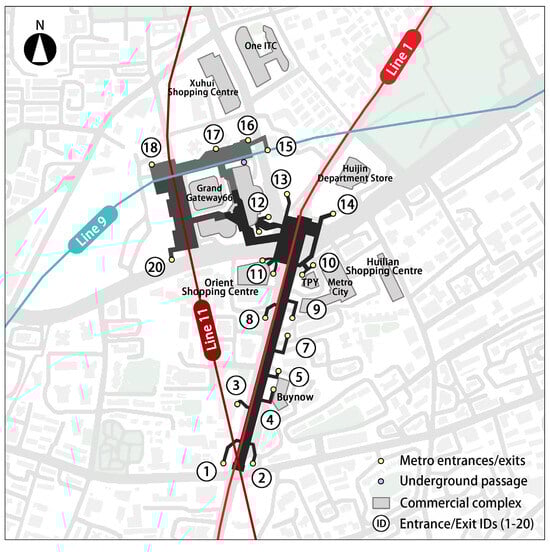 Xujiahui Station, located in Shanghai’s Xuhui District, is an interchange hub for Metro Lines 1, 9, and 11 (Figure 2). The station consists of three concourses linked by underground corridors. As of July 2025, 18 numbered entrances/exits providing ground-level access, together with one unnumbered underground passage connecting the Line 9 and Line 11 concourses to the Grand Gateway 66, were in operation. This study focused on the evaluation of the 18 numbered entrances/exits.