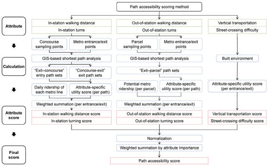 Subsequently, the path accessibility score was calculated for each metro entrance/exit. Within the framework of the discrete choice model, the utility function assumes additive separability, meaning that the partial utility of each attribute can be independently estimated and aggregated to obtain overall utility [59]. Based on this principle, exit-level scoring was conducted (Figure 3).