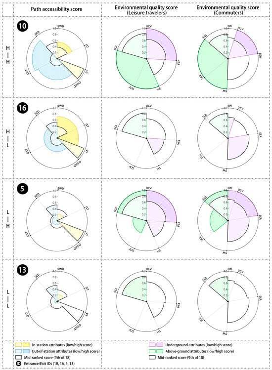 The visualization of the two-dimensional evaluation results for each entrance/exit at Xujiahui Station also demonstrates that incorporating passengers’ subjective preference data into micro-scale station-area optimization enables a shift from objective indicator–based assessments to diagnostics more closely aligned with passengers’ actual needs. The proposed framework not only establishes an analytical foundation for identifying the relative strengths, weaknesses, and improvement potential of each entrance/exit but also provides strategic guidance for integrating station-internal and urban environmental interventions to enhance passenger experience, while emphasizing the coordinated development of path accessibility and environmental quality within station areas.