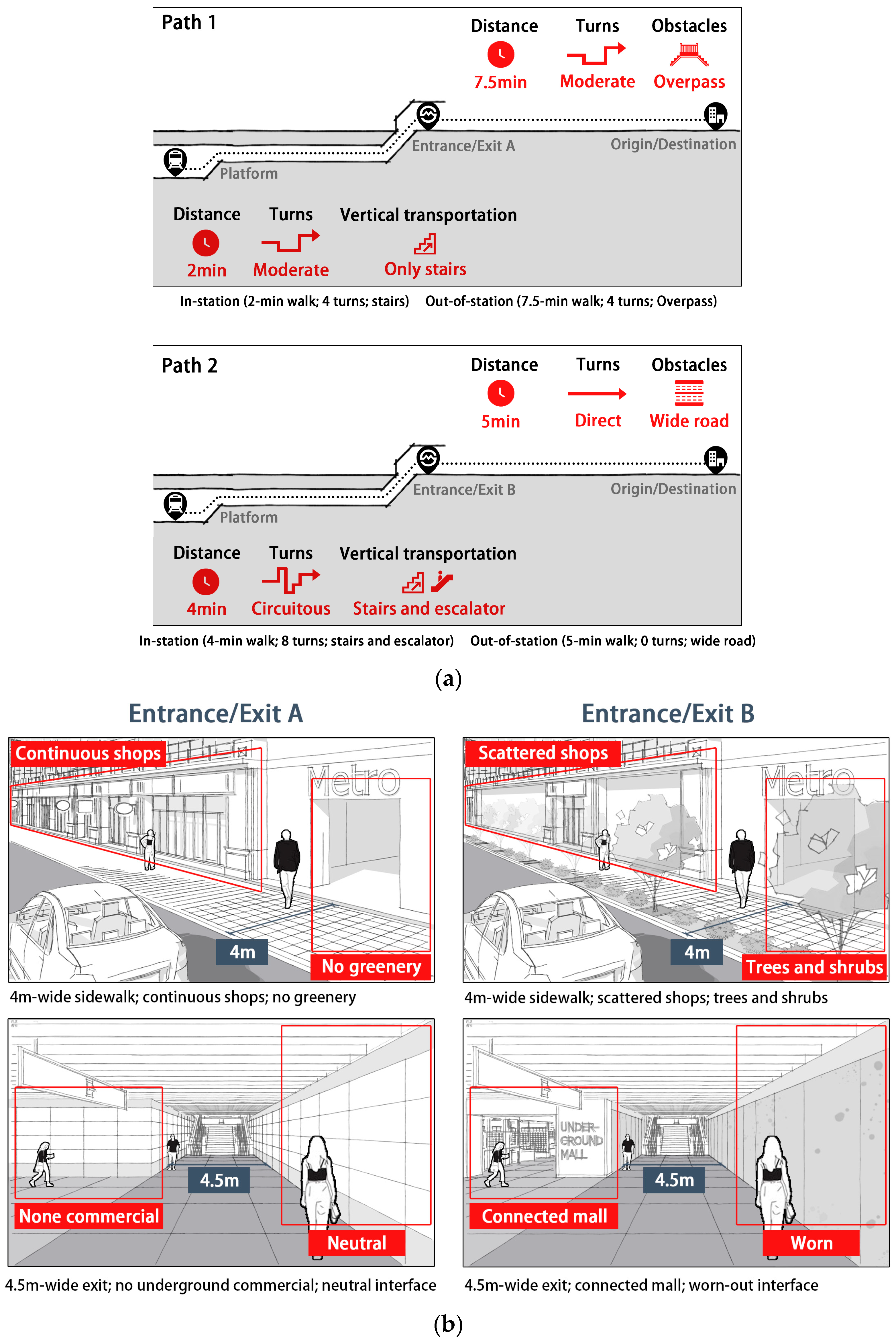 | Environmental quality | Underground attributes | Entrance/exit width | Cai et al. [34] | The width of metro entrance/exit. | 3 m; 4.5 m; 6 m |