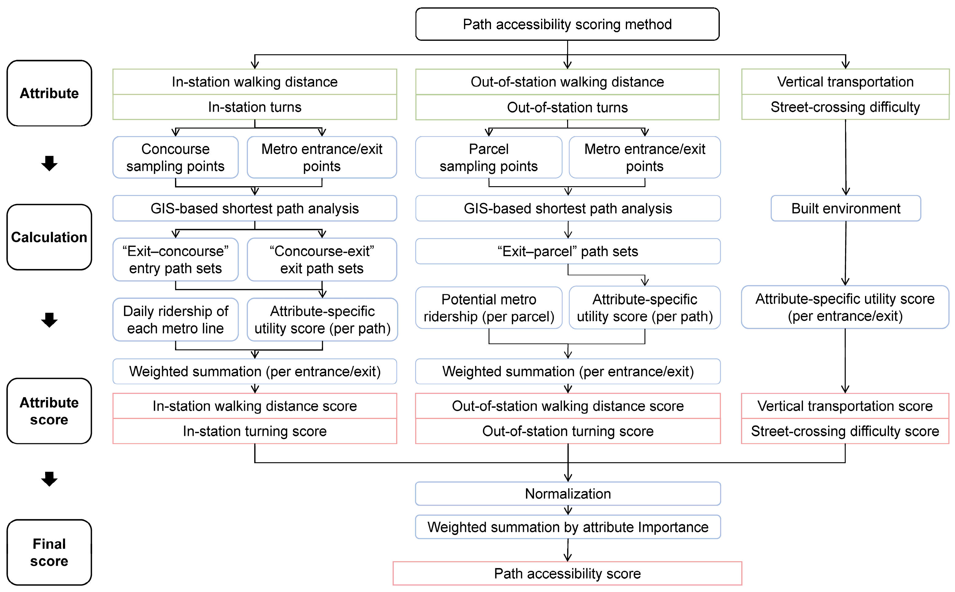 | Path accessibility | Underground attributes | In-station walking distance | Xu and Chen [7], Cai et al. [34], Huo et al. [35], Feng et al. [36], Mandal et al. [37], Mandal et al. [38] | The shortest walking distance from platform to metro entrance/exit. | 150 m; 300 m; 450 m |