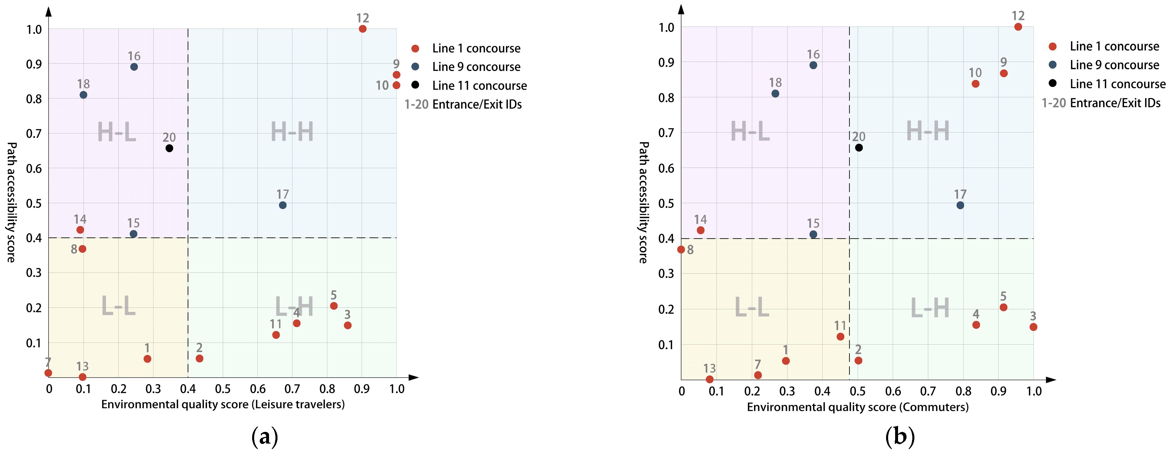 - Yan, C.; Gao, Y.; Yang, Y. Exploring the Spatial Patterns of Accessibility to Metro Services Considering the Locations of Station Entrances/Exits. Buildings 2024, 14, 3532. [Google Scholar] [CrossRef]