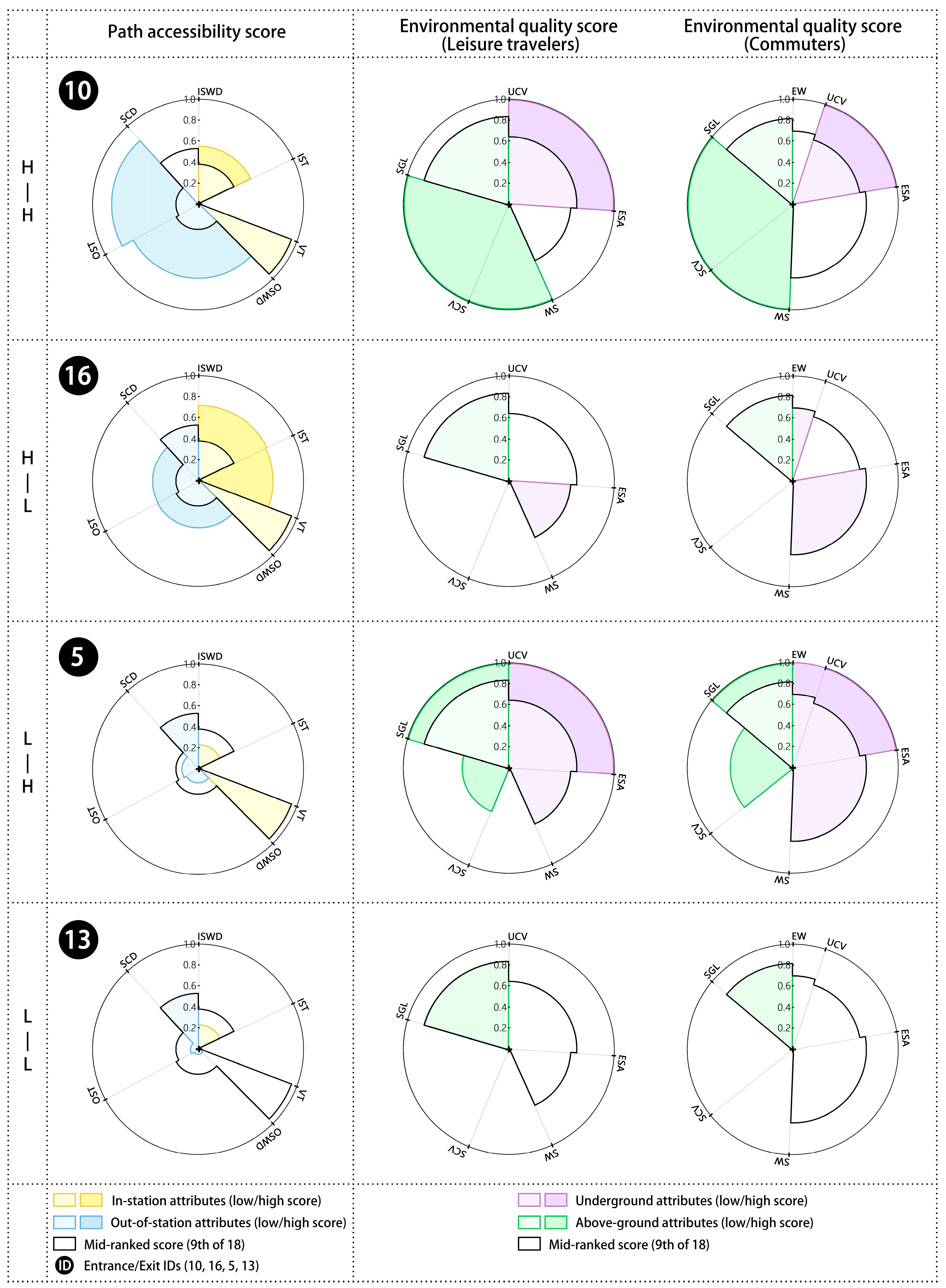 | In-station turns | Gu and Osaragi [41] | The number of turns along the shortest path from platform to metro entrance/exit. | None; 4 turns; 8 turns | ||