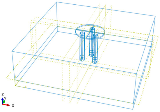 The loading plate is modeled as a cylindrical element with a diameter of 0.64 m and a thickness of 0.02 m. The sandy soil layer is represented by a cuboid measuring 2.5 m × 2.5 m × 0.7 m, while the underlying stiff soil layer has dimensions of 2.5 m × 2.5 m × 0.15 m. The RCAEC is simulated as a cylinder with a diameter of 0.1 m and a length of 0.7 m, as depicted in Figure 1.