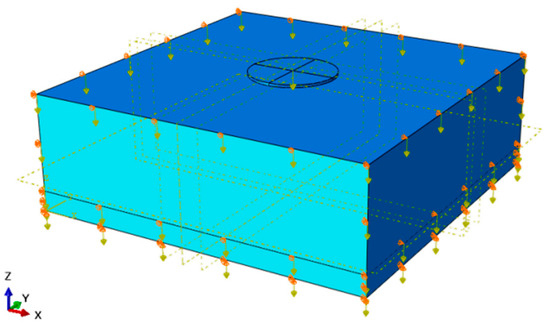 A surface-to-surface contact formulation was employed to simulate interactions between the geotextile encasement and the surrounding soil. The base of the model was fixed against vertical displacement, while the side boundaries were fixed against horizontal displacement. Due to strong interlocking and friction between the geotextile and the column material, no relative displacement was permitted at this interface; hence, no contact elements were defined internally. Contact was explicitly modeled only between the geotextile encasement and the sandy soil layer, allowing for possible relative slip, as illustrated in Figure 2.
