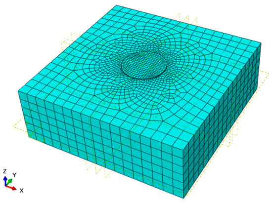 The finite element model was discretized using 8-node linear brick (C3D8R) elements. A global seeding was first applied, followed by localized edge seeding in regions requiring higher computational accuracy, such as the vicinity of the geosynthetic-encased recycled concrete aggregate column, to create a refined mesh. Conversely, in areas farther from the column where precise results are less critical, a coarser mesh was adopted to enhance computational efficiency Figure 3.