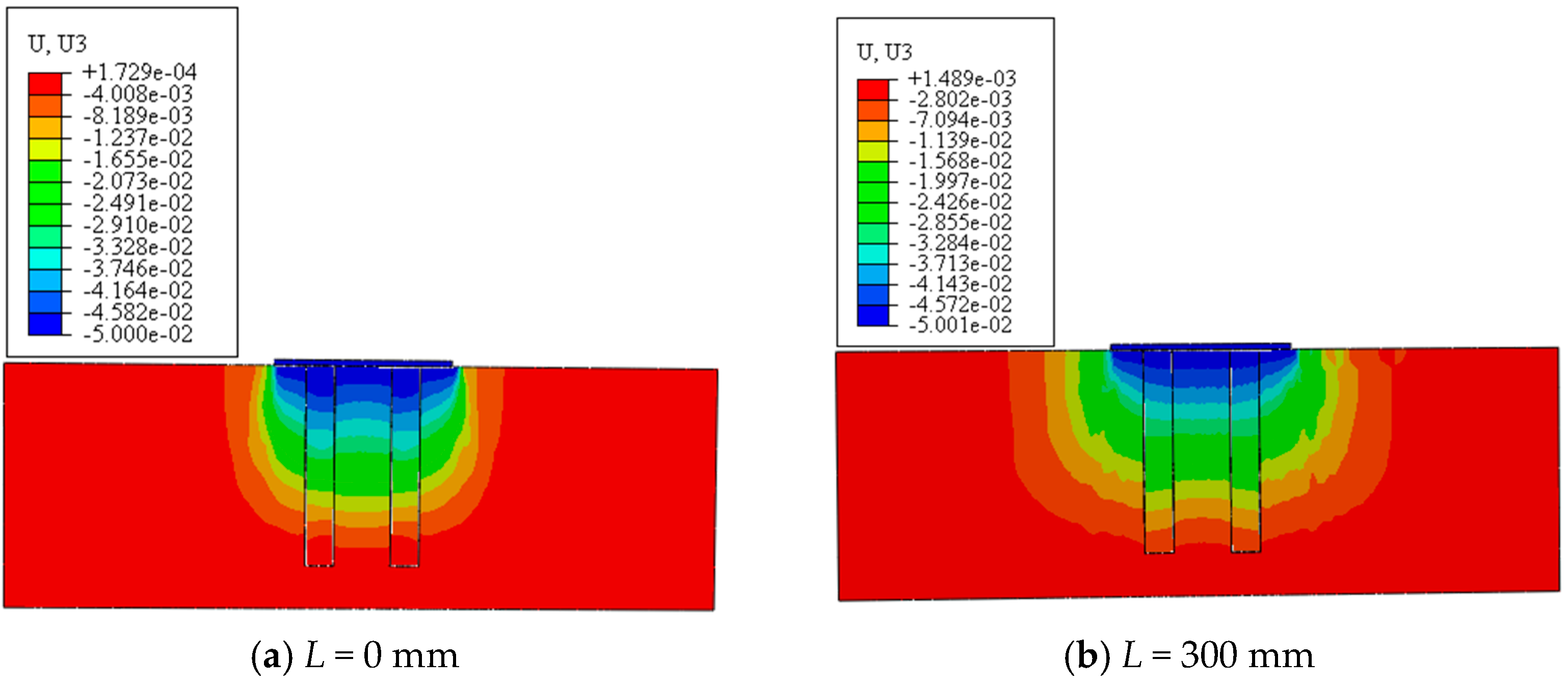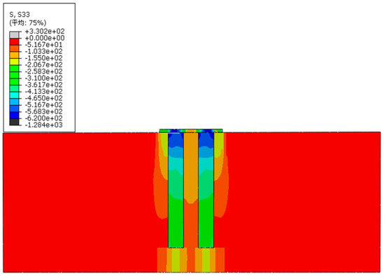 The resulting vertical displacement and stress contours are presented in Figure 10 and Figure 11, respectively. The load–settlement curves for the columns are shown in Figure 12, with the bearing capacity quantified as the load corresponding to a settlement of 50 mm.