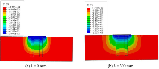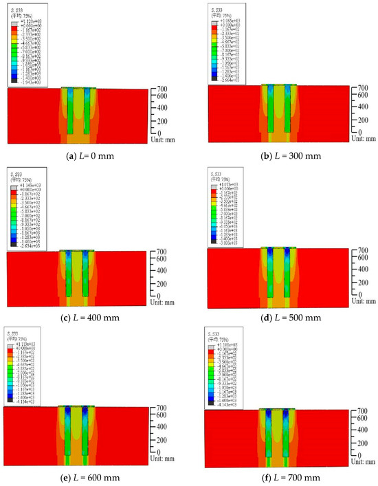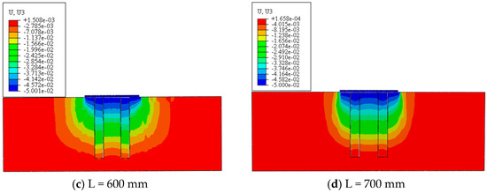 Figure 6 and Figure 7 present the vertical displacement and stress contours, respectively. The results show that under the same displacement level, longer encasement lengths lead to higher vertical stresses in the RCAEC, with stress concentration primarily observed in the upper 1–3 diameters. The bearing capacity was quantified as the load corresponding to a settlement of 50 mm [10,40]. The load–settlement curves for the columns are shown in Figure 8.