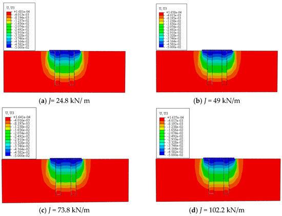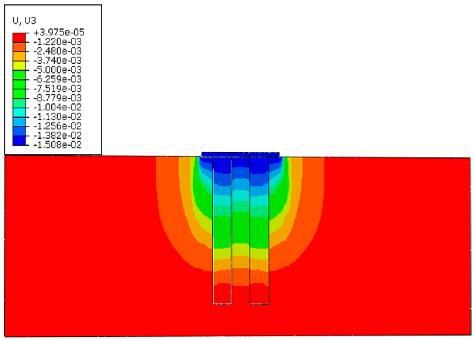 Based on the numerical simulation results, the contour plot of vertical displacement for the geosynthetic-encased recycled concrete aggregate column composite foundation is presented in Figure 4.
