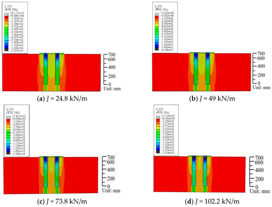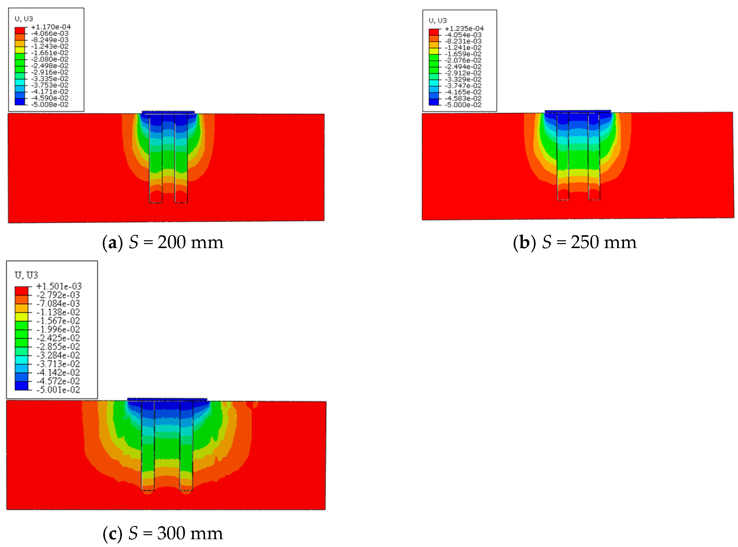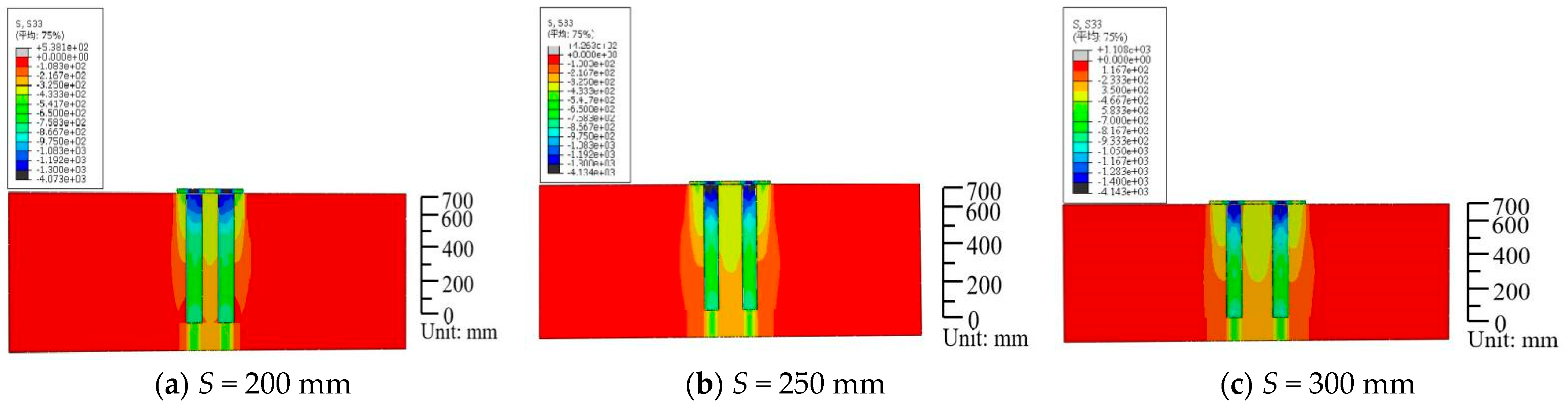 This section examines the effect of column spacing on the deformation and stress distribution of RCAEC composite foundations. While keeping other parameters—including column length, diameter, encasement length, and stiffness—constant, column spacings of 2 d, 2.5 d, and 3 d were considered (S = 200 mm, 250 mm and 300 mm), corresponding to area replacement ratios (m) of 0.227, 0.145, and 0.101, respectively. The resulting stress and displacement contours under corresponding loading conditions are presented in Figure 14 and Figure 15.