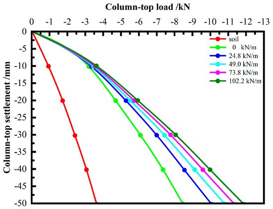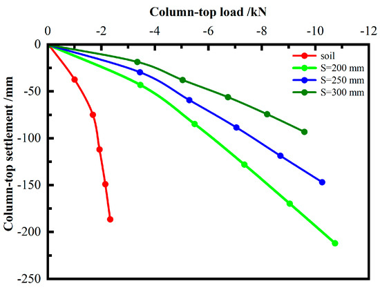 Based on the numerical model of the composite foundation, the load–settlement curve for the column head was plotted. The ultimate load of the column was defined as the load corresponding to a settlement of 50 mm. The results are shown in Figure 16.