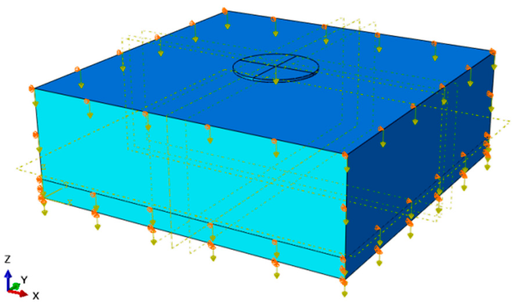 In the numerical model, the Mohr–Coulomb constitutive model was adopted for the stiff soil layer, sand layer, and RCAEC. To enhance computational convergence, an asymmetric solver was utilized in the analysis step. Surface-to-surface contact was defined with the circumferential surface of the RCAEC as the master surface and the surrounding sand as the slave surface. Similarly, the top surface of the stiff soil layer was set as the master surface interacting with the bottom surface of the RCAEC as the slave. The normal contact behavior was defined as “Hard” contact, while the tangential behavior was modeled using the penalty method with a friction coefficient of 0.3. To simplify the model and improve convergence, the interfaces between the loading plate and both the top of the RCAEC and the sand surface were defined as “Tie” constraints.