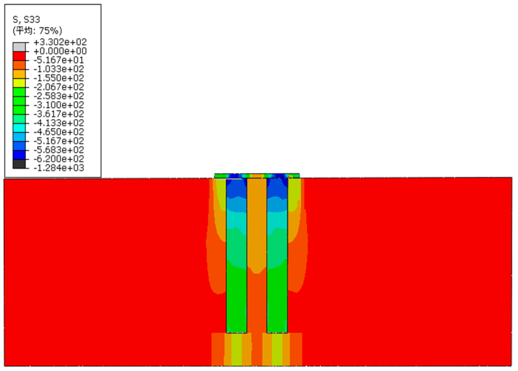 To further validate the accuracy of the numerical model, the vertical stress of the composite foundation under the ultimate load state was analyzed. Figure 5 shows the vertical stress contour of the composite foundation with a replacement ratio of 0.227. It can be observed that the stress is primarily concentrated in the geosynthetic-encased recycled concrete aggregate column, with only minimal stress distributed in the surrounding soil. Within the column, the stress is mainly focused at the top, while a portion is also transmitted to the bottom, which is consistent with the phenomena observed in the model tests. Overall, the settlement and vertical stress of the composite foundation obtained from the numerical model show good agreement with the experimental results, indicating that the present numerical model is capable of effectively simulating the bearing and deformation behavior of the geosynthetic-encased recycled concrete aggregate column composite foundation.