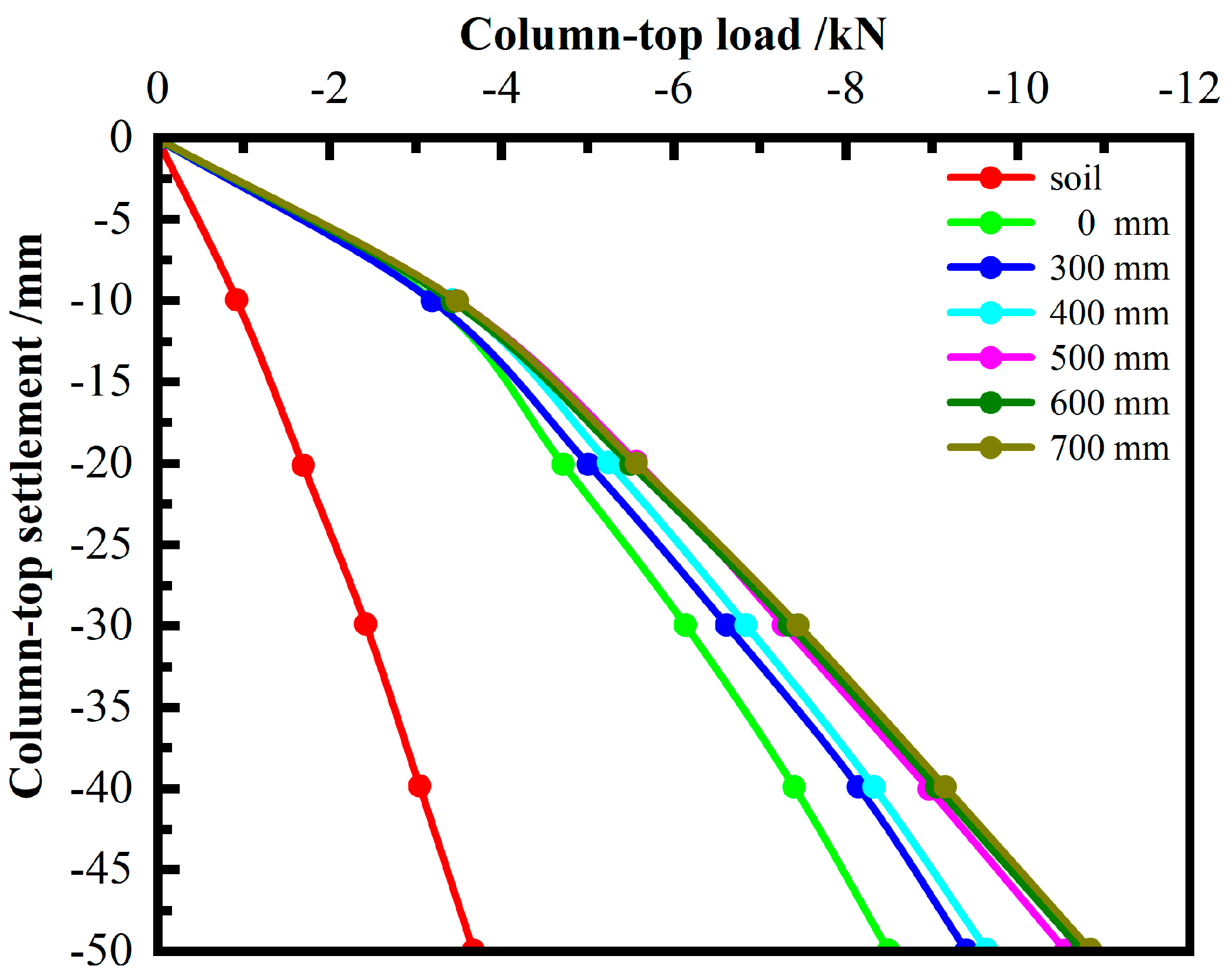 As shown in Figure 7, at a settlement of 50 mm, the column-top load of the composite foundation with RCAEC is consistently higher than that of the unencased column foundation, indicating a significant improvement in ultimate bearing capacity due to encasement. Moreover, the ultimate load capacity increases progressively with encasement length, rising from 8.45 kN for the unencased column to 10.80 kN for the fully encased (700 mm) case.