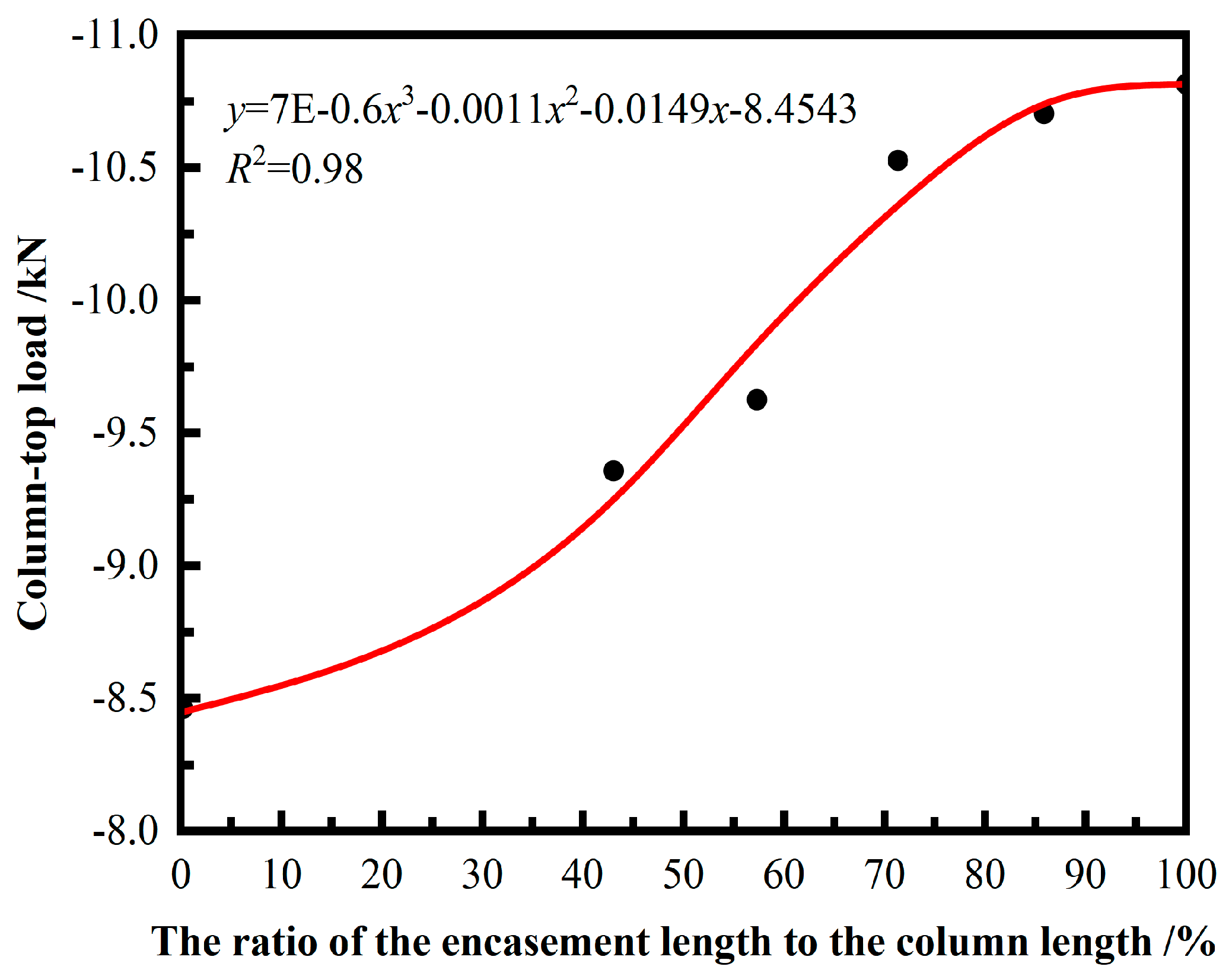 (1) When the ratio of encasement length to column length falls within the range of 20% to 94%, increasing the encasement length significantly enhances the column’s load-bearing capacity. Specifically, once the column-top load exceeds 3 kN, columns with encasement lengths of 5 d, 6 d, and 7 d demonstrate far superior load-bearing performance compared to those with 3 d and 4 d encasement lengths. The maximum bearing capacity increased by 27.8%. Therefore, it is recommended to set the encasement length at 5 to 7 times the column diameter in design.