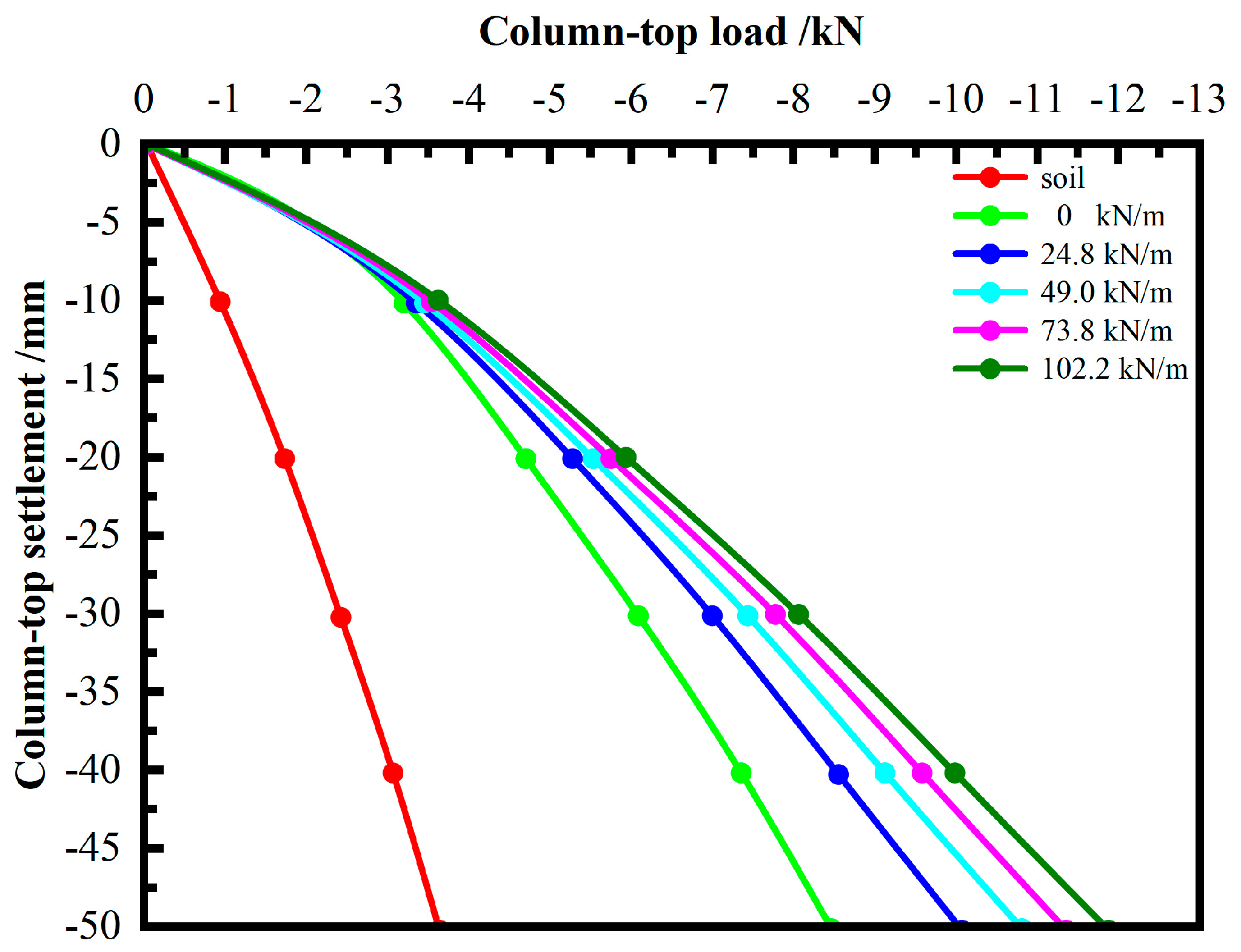 Figure 12 shows that at a settlement of 50 mm, the column-top load of the RCAEC composite foundation is consistently higher than that of the unencased column foundation, confirming that encasement significantly improves the ultimate bearing capacity. With increasing encasement stiffness, the ultimate load capacity rises progressively—from 8.45 kN for the unencased column to 10.80 kN for the geotextile-encased column (102.2 kN/m stiffness) and 11.88 kN for the geomembrane-encased column.