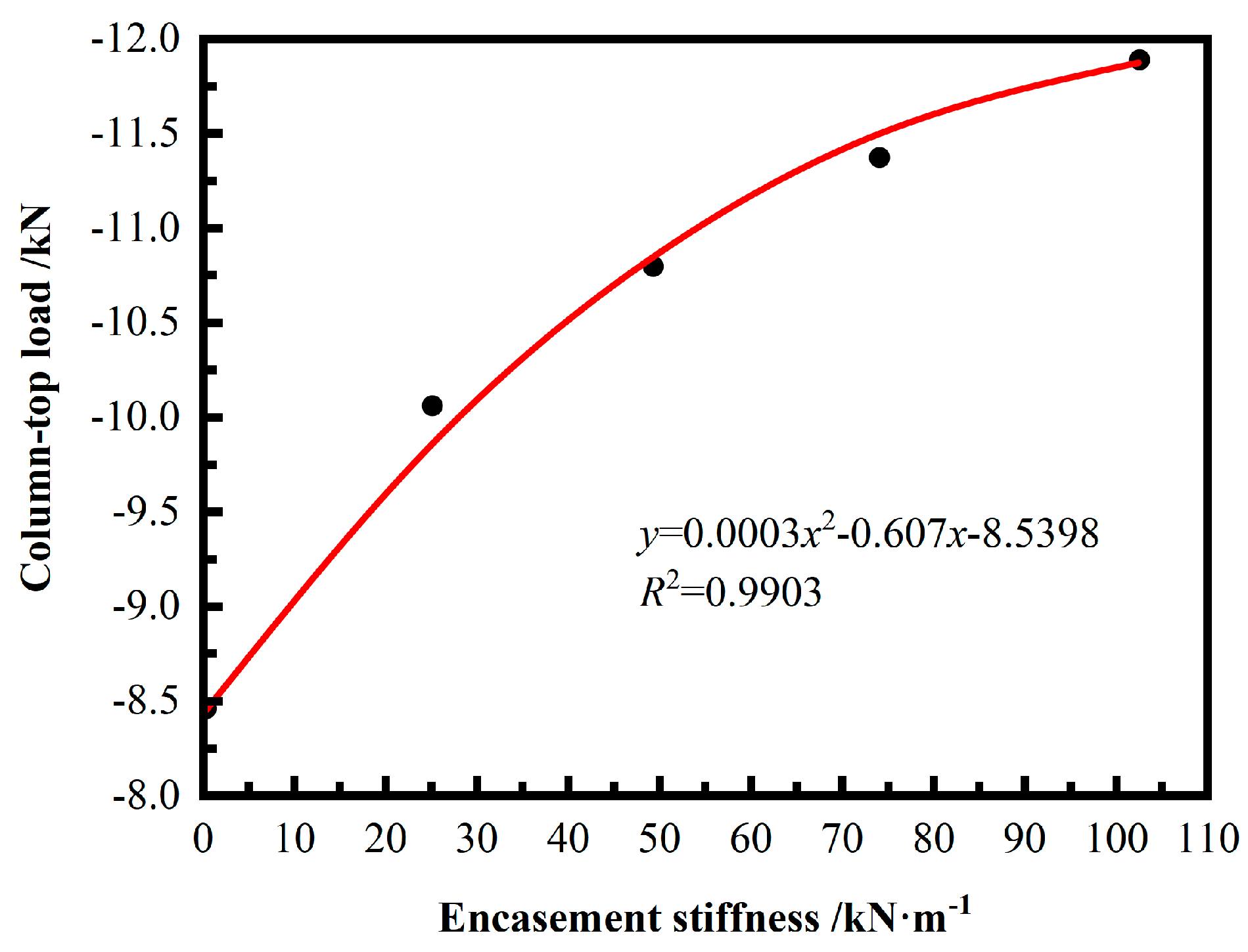 To further quantify this relationship, the column-top loads corresponding to a settlement of 50 mm were extracted for different encasement stiffnesses (Table 3). The variation in column-top load with encasement stiffness is illustrated by the fitted scatter plot in Figure 11.