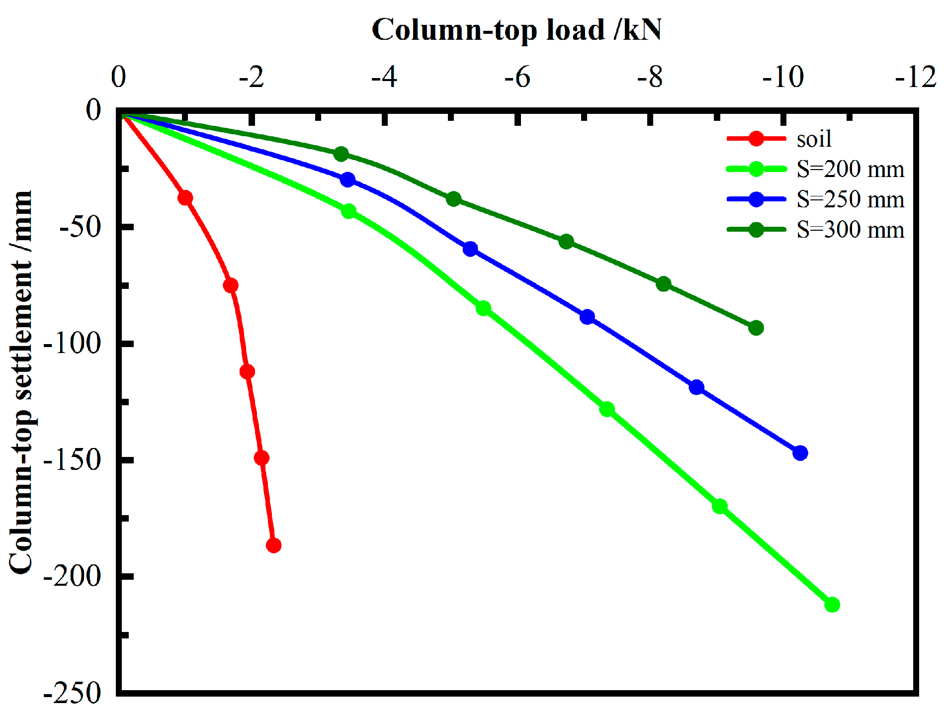 (4) Reducing column spacing can effectively enhance the overall bearing capacity of composite foundations, yielding superior reinforcement effects. However, this strengthening effect is accompanied by a decrease in the column-to-soil stress ratio.